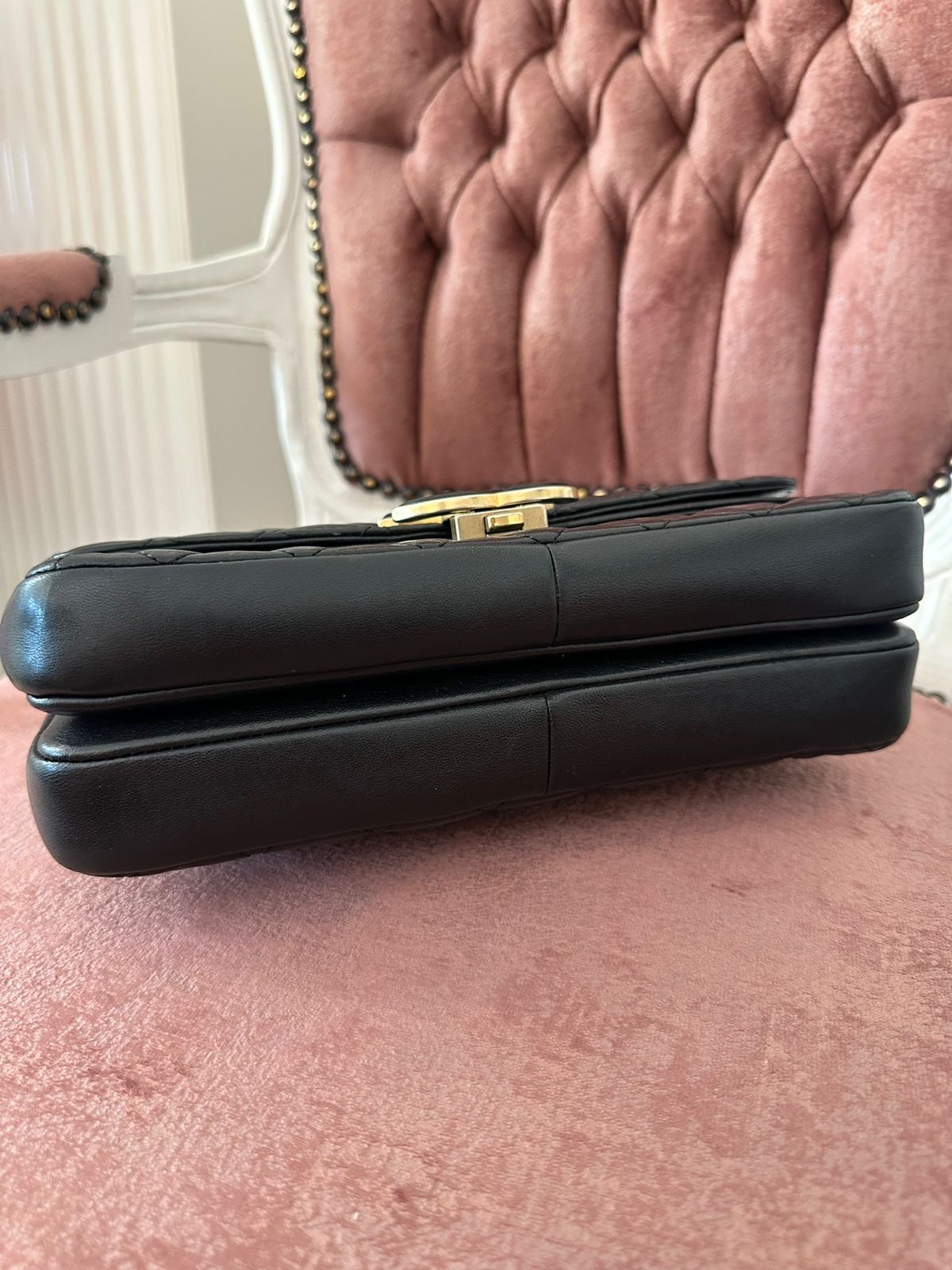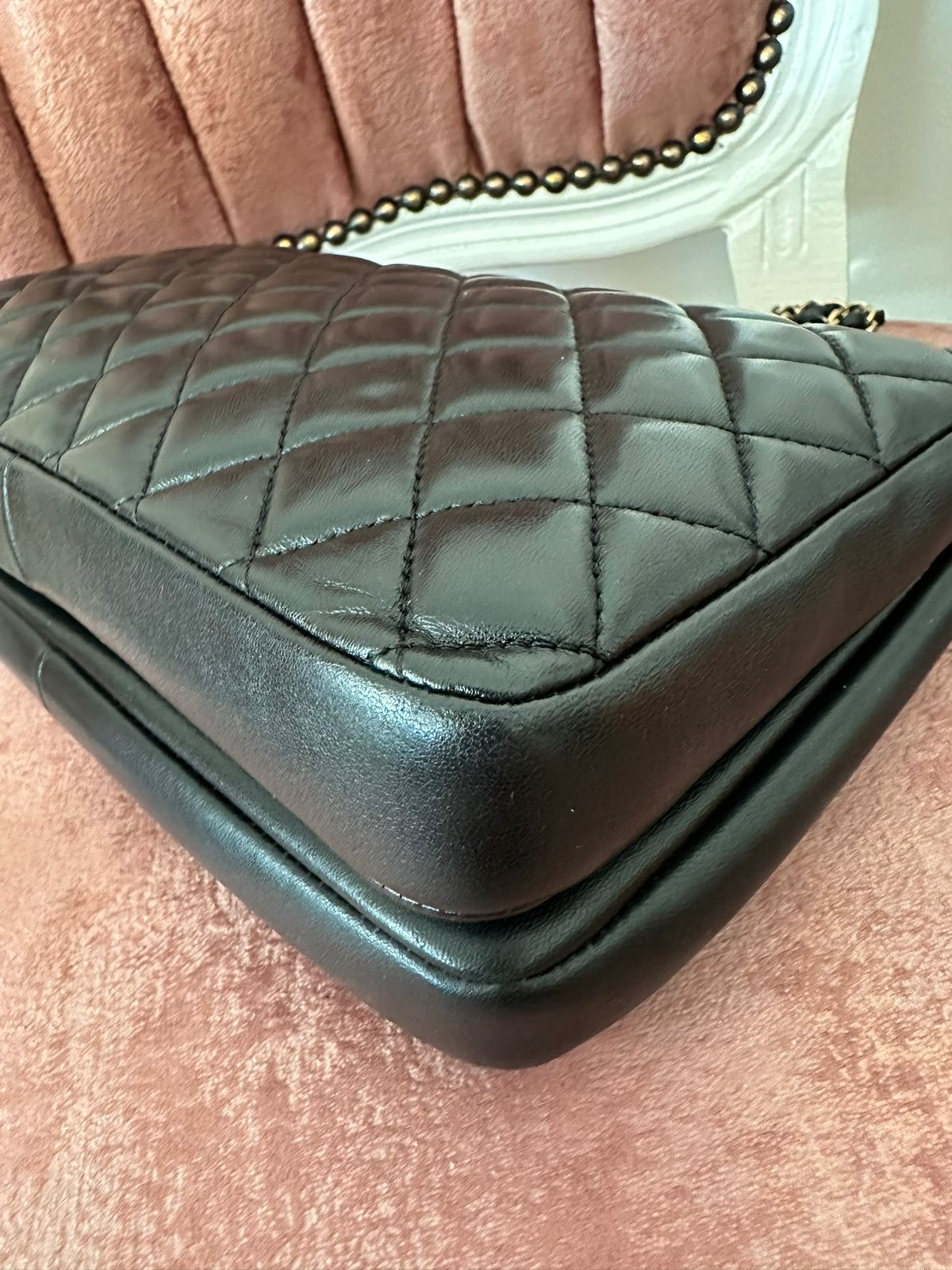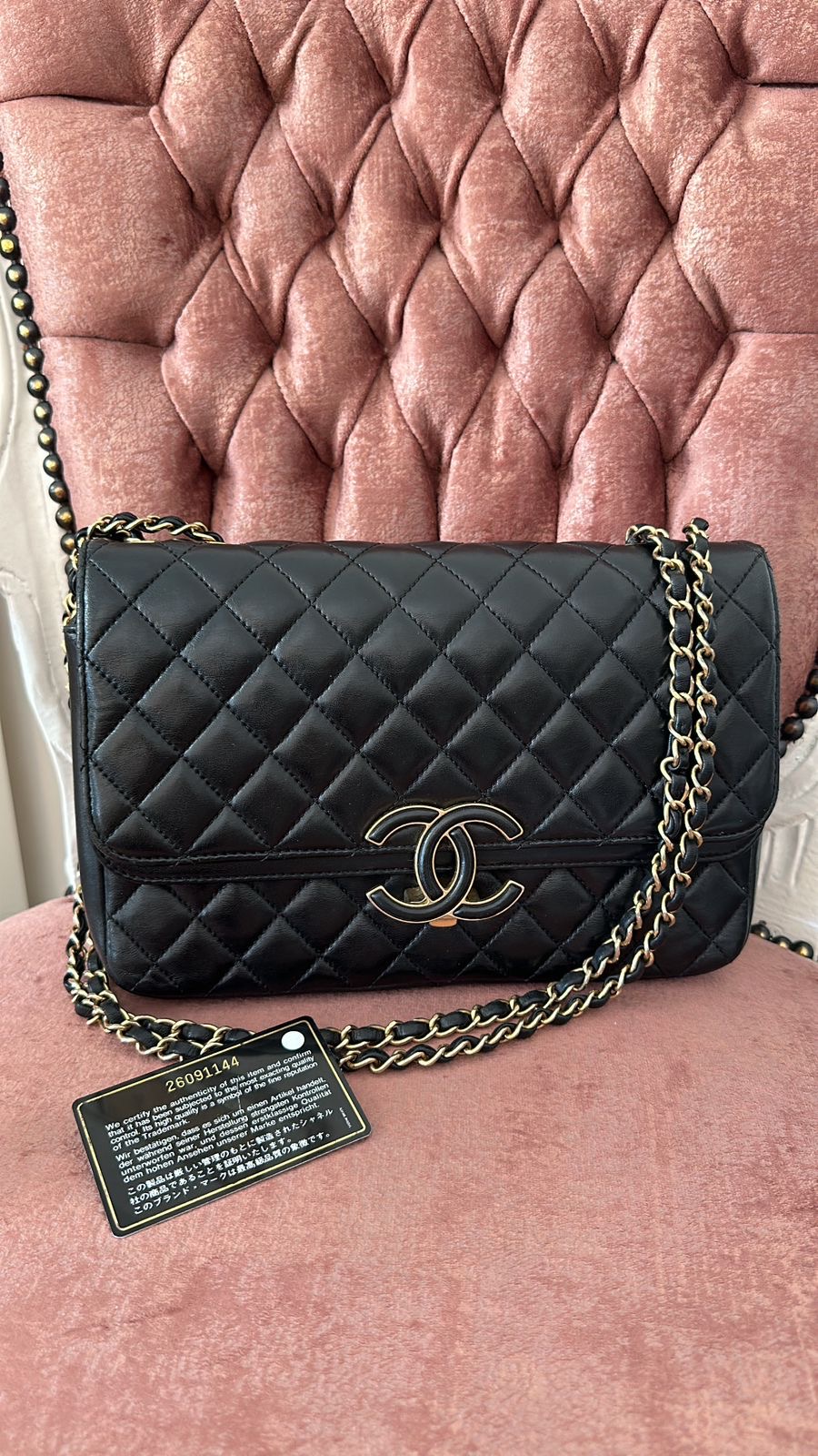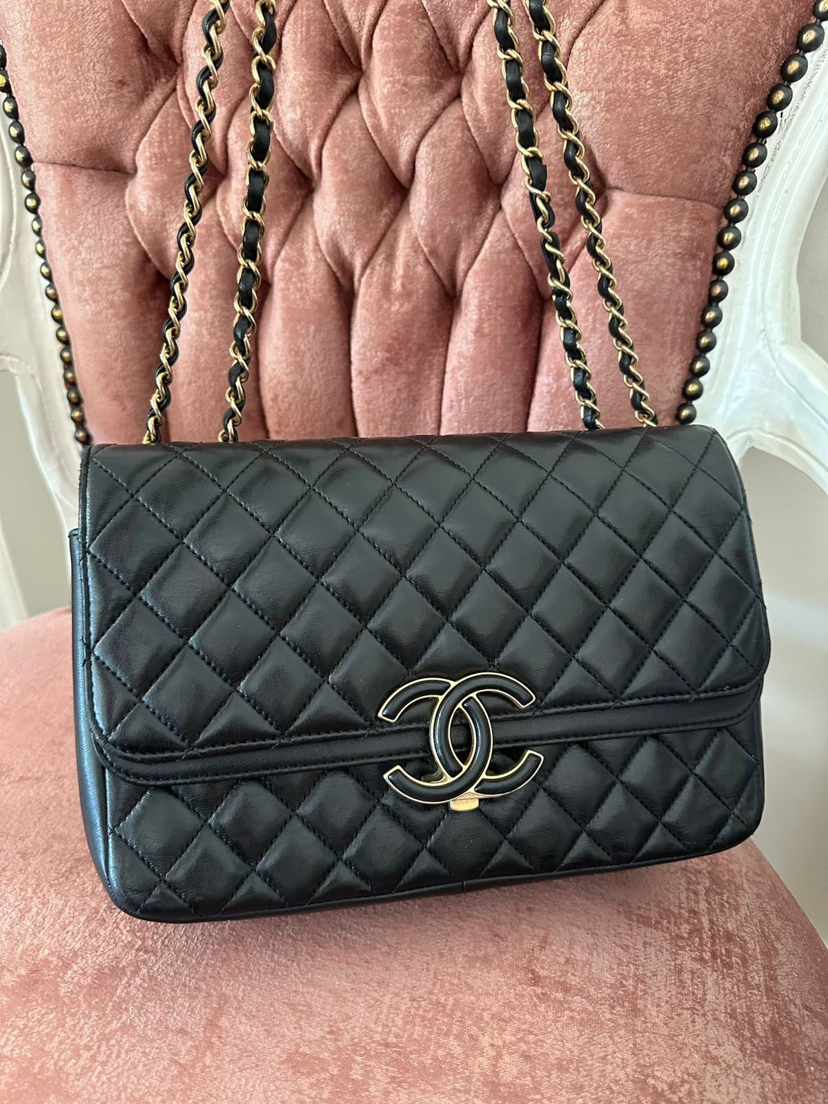 This is an authentic CHANEL Lambskin Quilted CC Chic Flap in Black. This stylish bag is crafted of diamond quilted lambskin leather in black. This flap bag also features a gold chain link shoulder strap threaded with leather and a frontal flap with a leather and gold CC turn lock. This opens to a black partitioned leather interior with zipper and patch pockets.