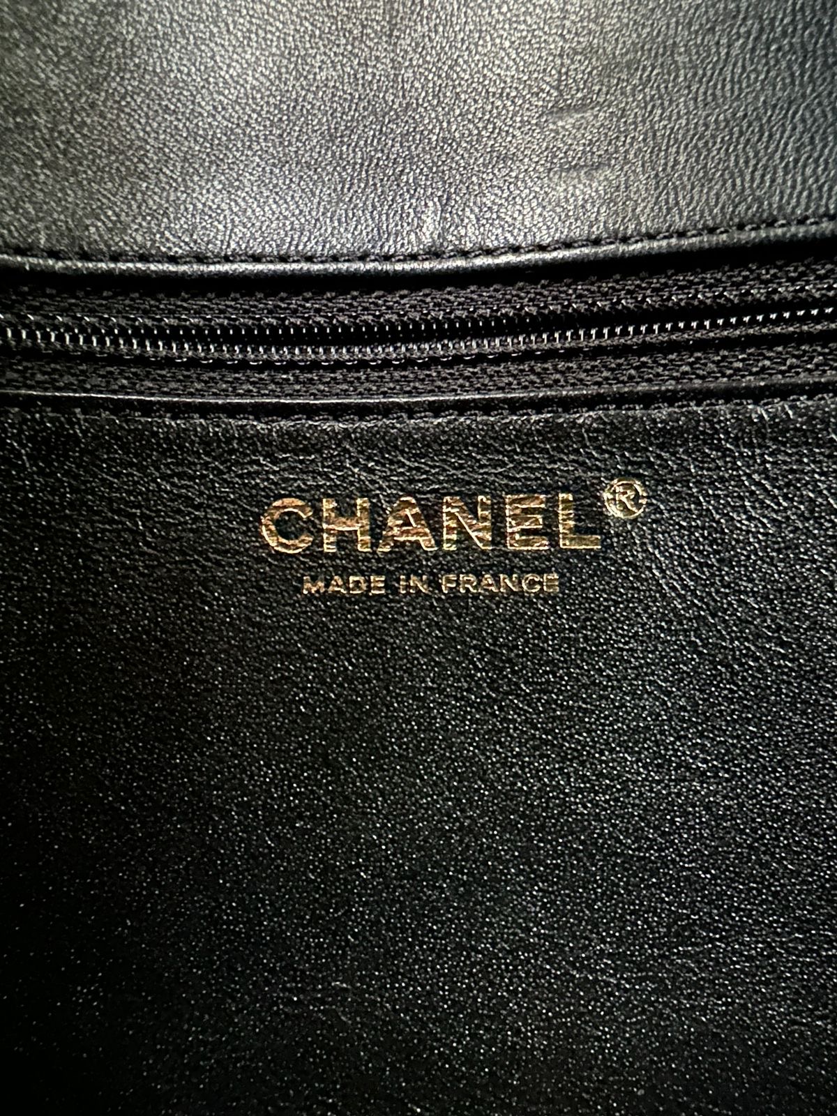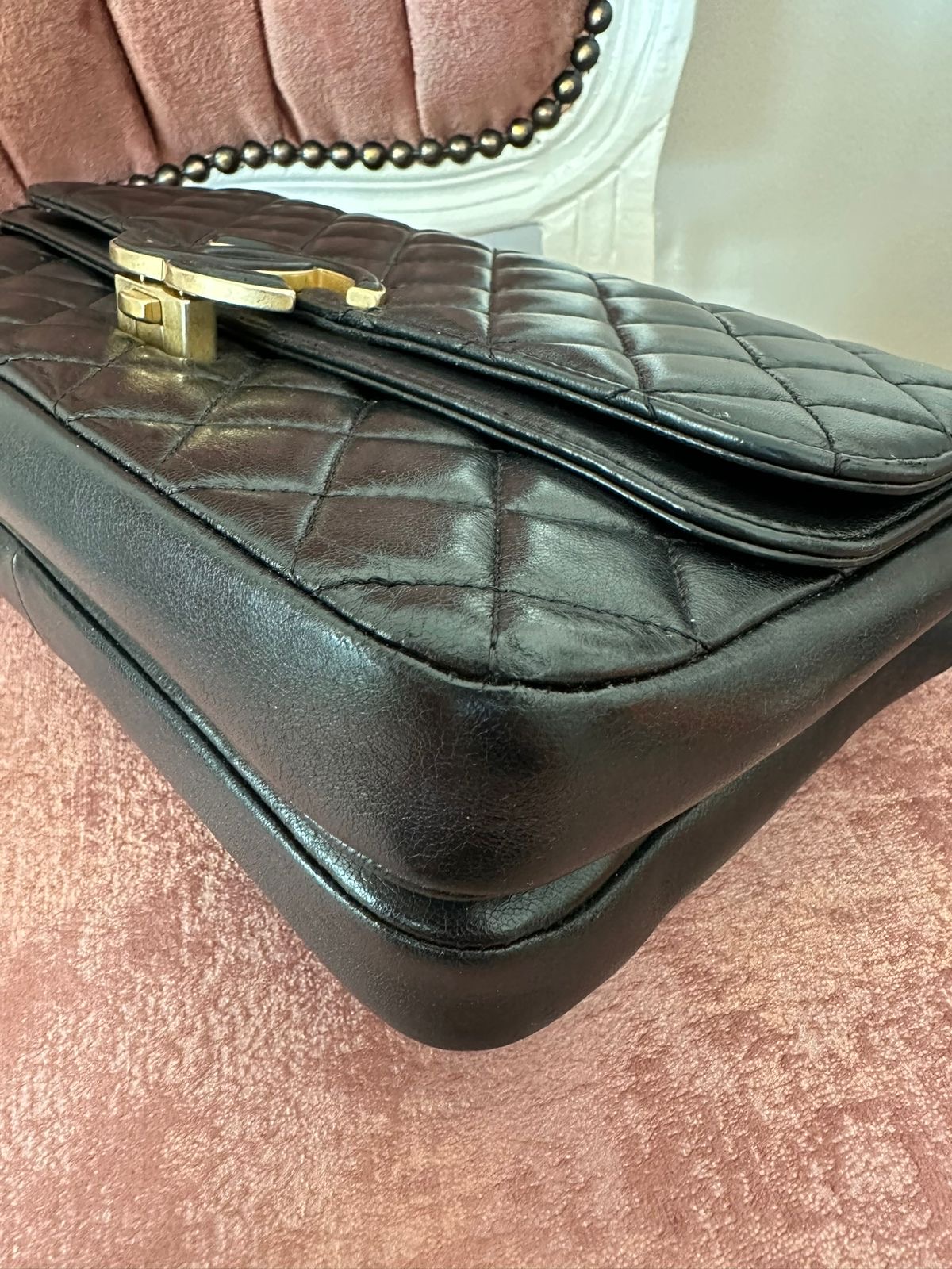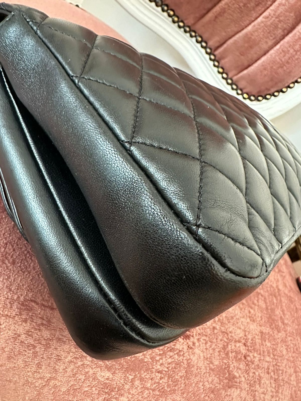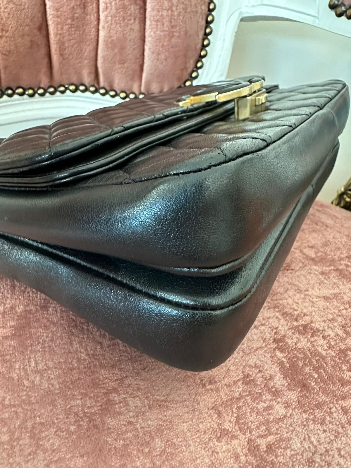 This is an authentic CHANEL Lambskin Quilted CC Chic Flap in Black. This stylish bag is crafted of diamond quilted lambskin leather in black. This flap bag also features a gold chain link shoulder strap threaded with leather and a frontal flap with a leather and gold CC turn lock. This opens to a black partitioned leather interior with zipper and patch pockets.