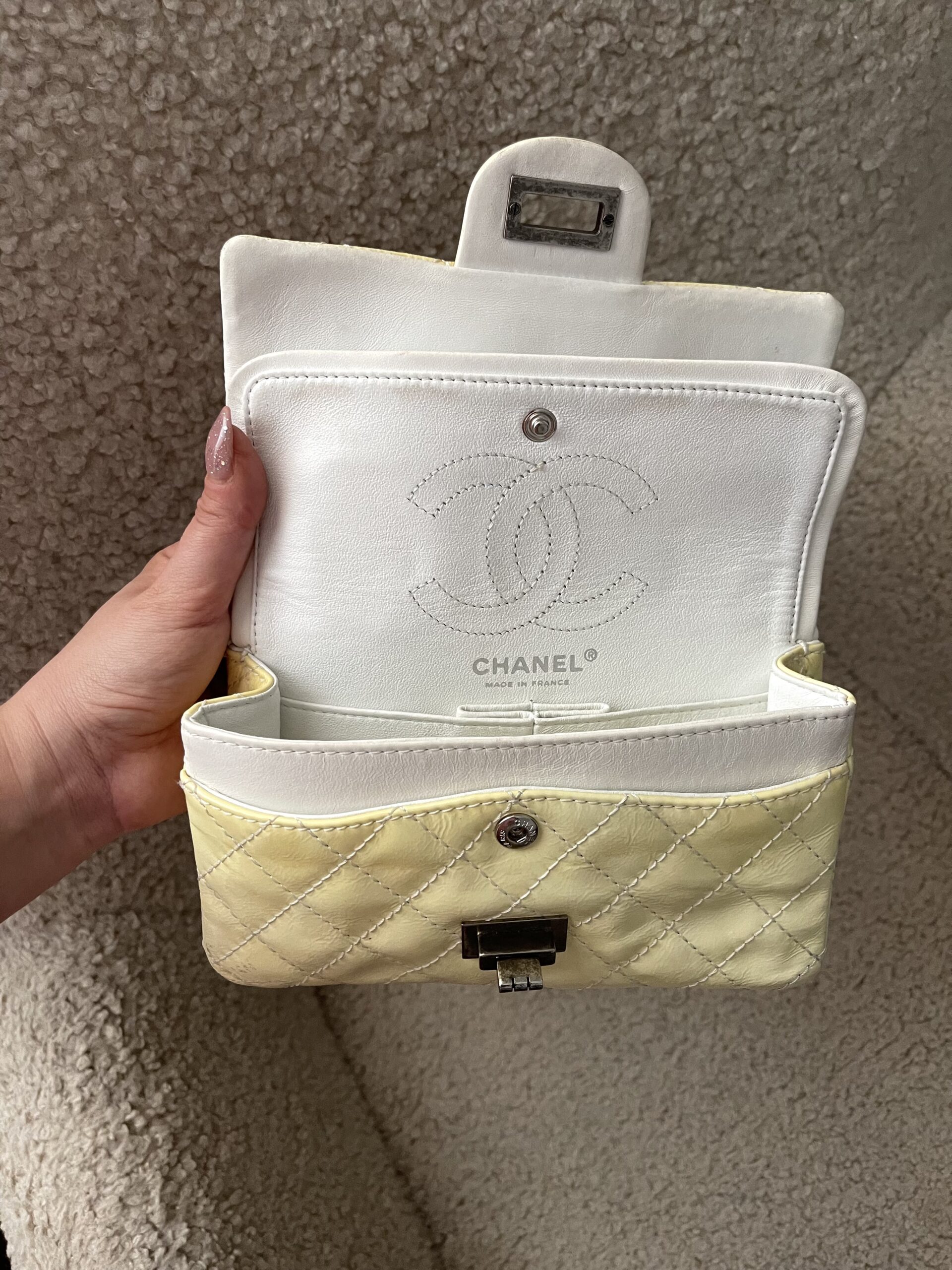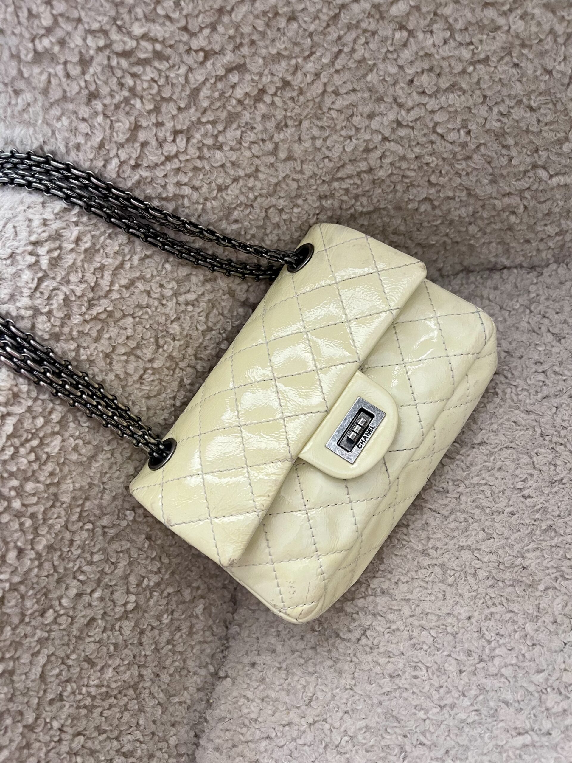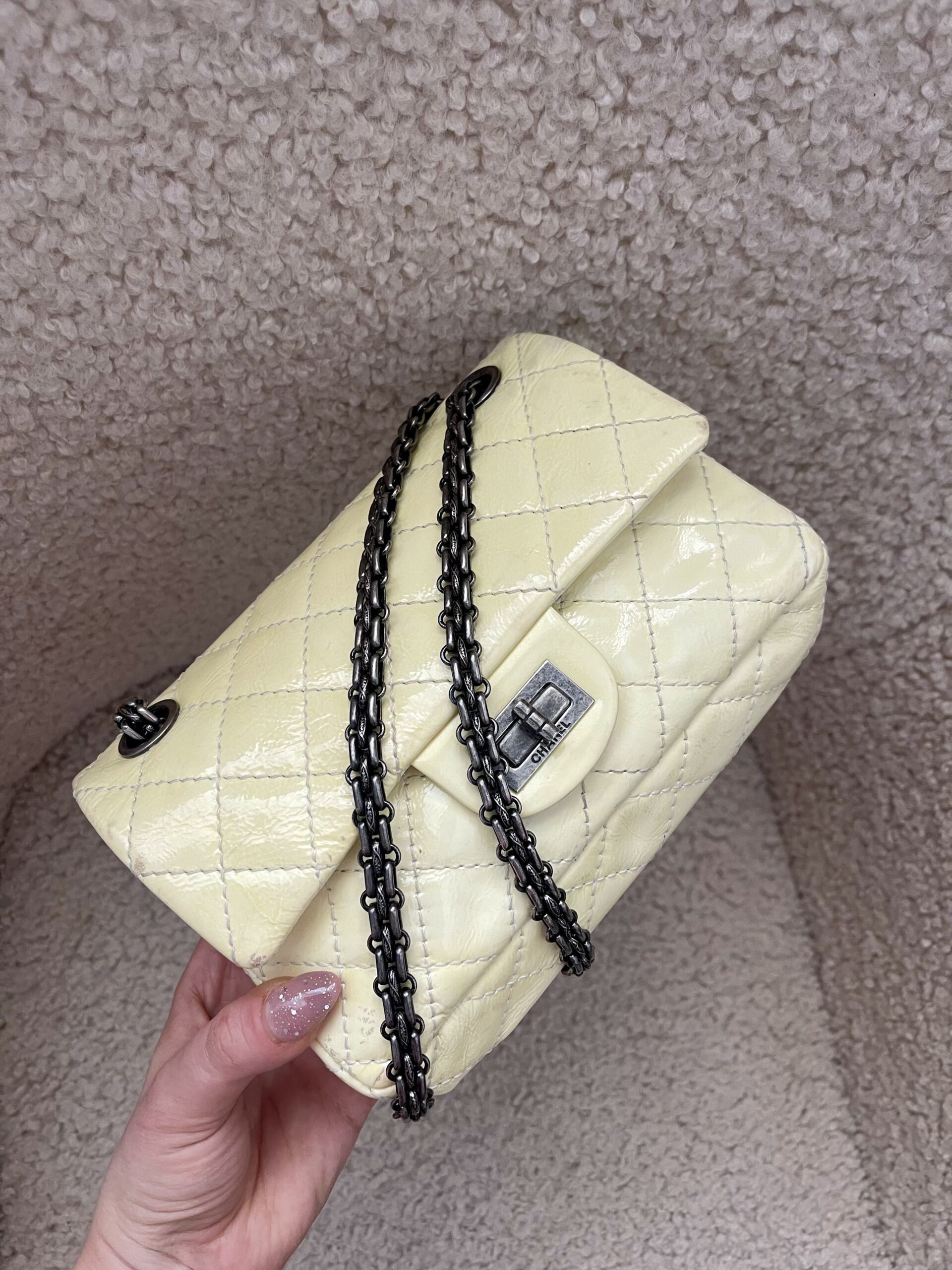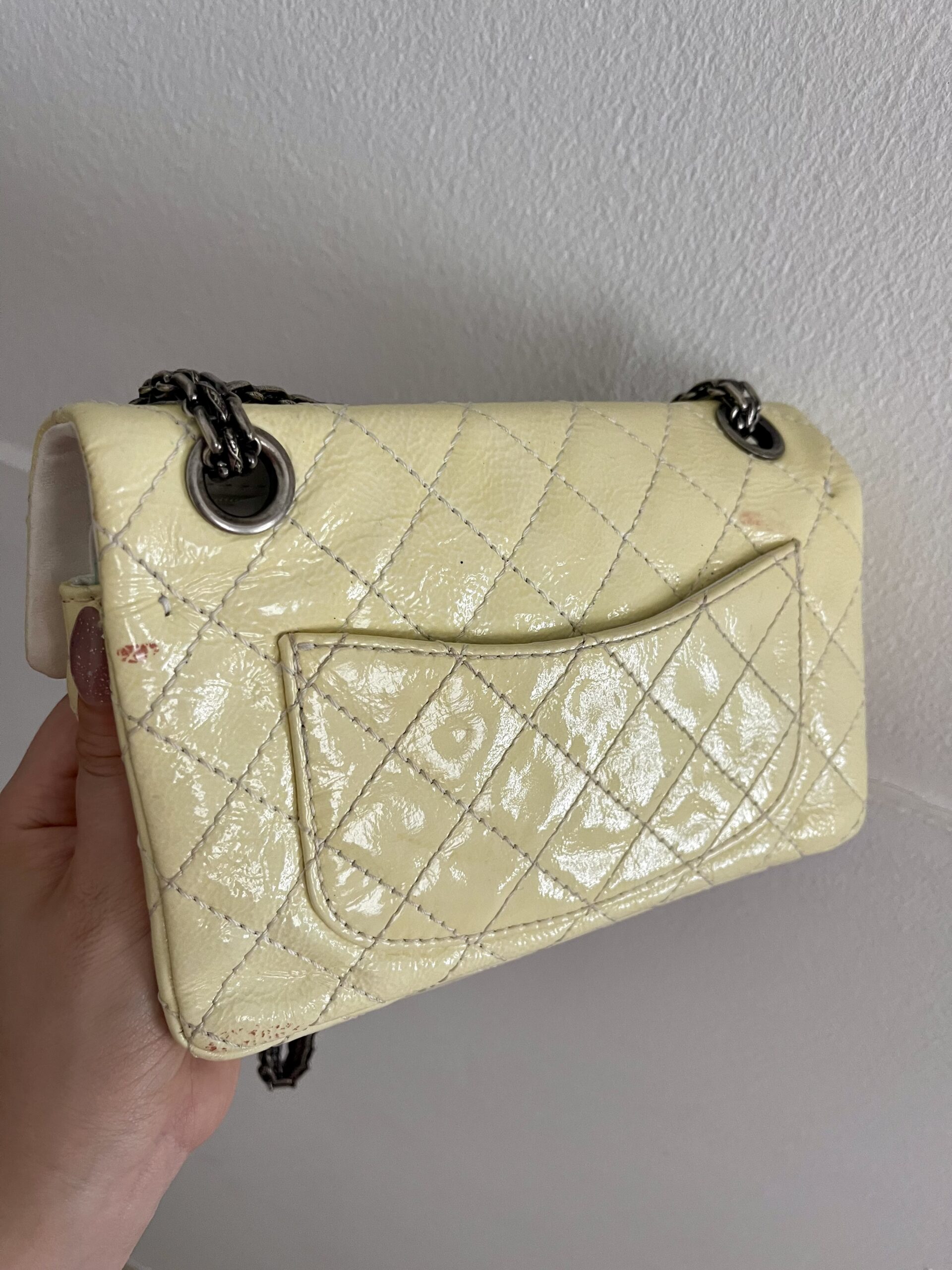 This is an authentic CHANEL Patent Calfskin Quilted 2.55 Reissue Mini Flap in Yellow. This stylish shoulder bag is beautifully crafted of diamond quilted patent calfskin leather in yellow. The bag features a grey reissue chain shoulder strap and a grey Chanel mademoiselle turn-lock. This opens to a double flap white leather interior with zipper and patch pockets.