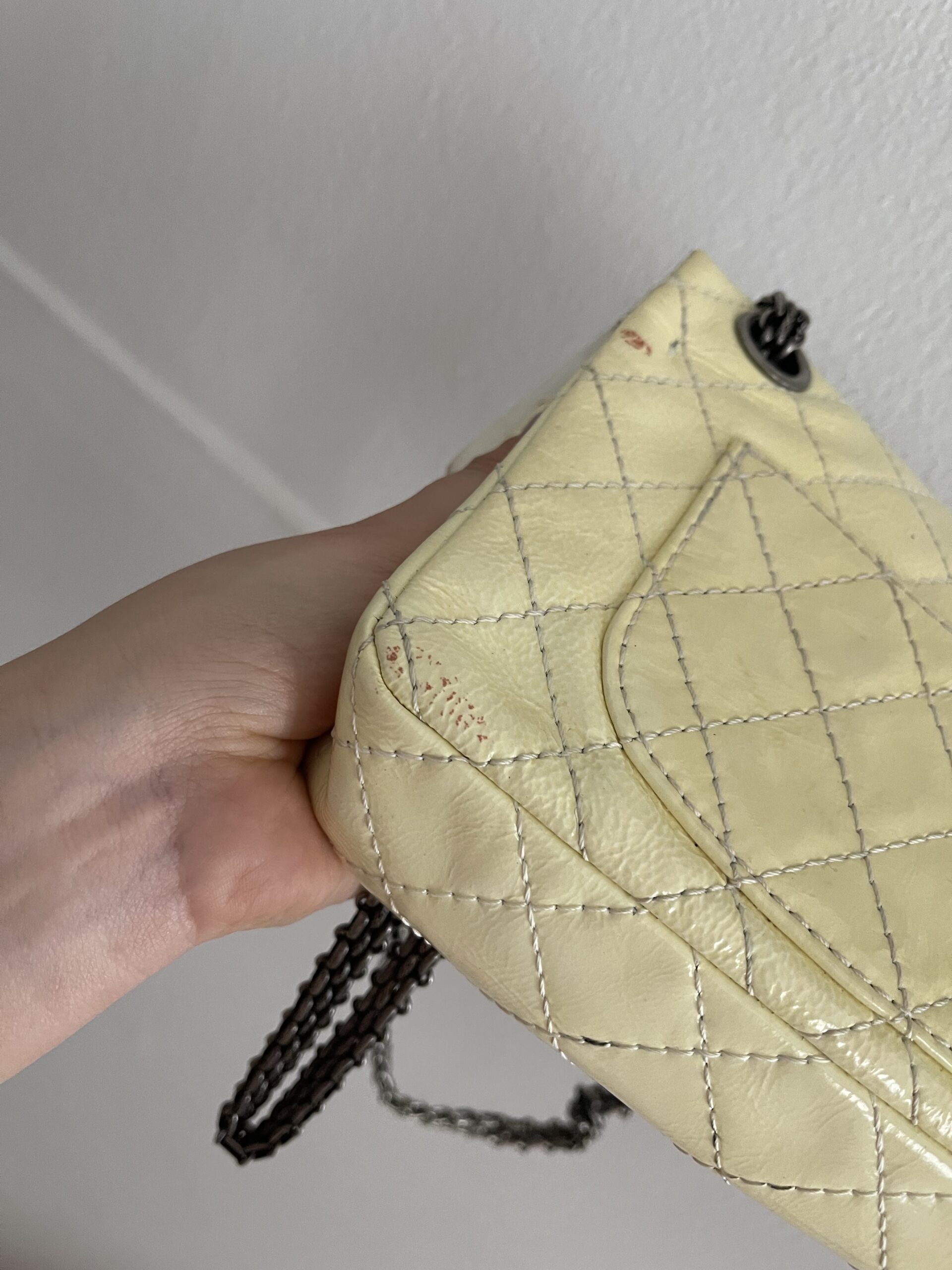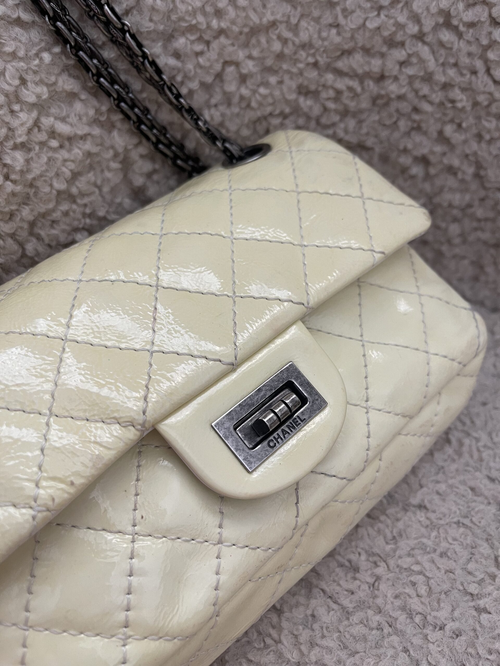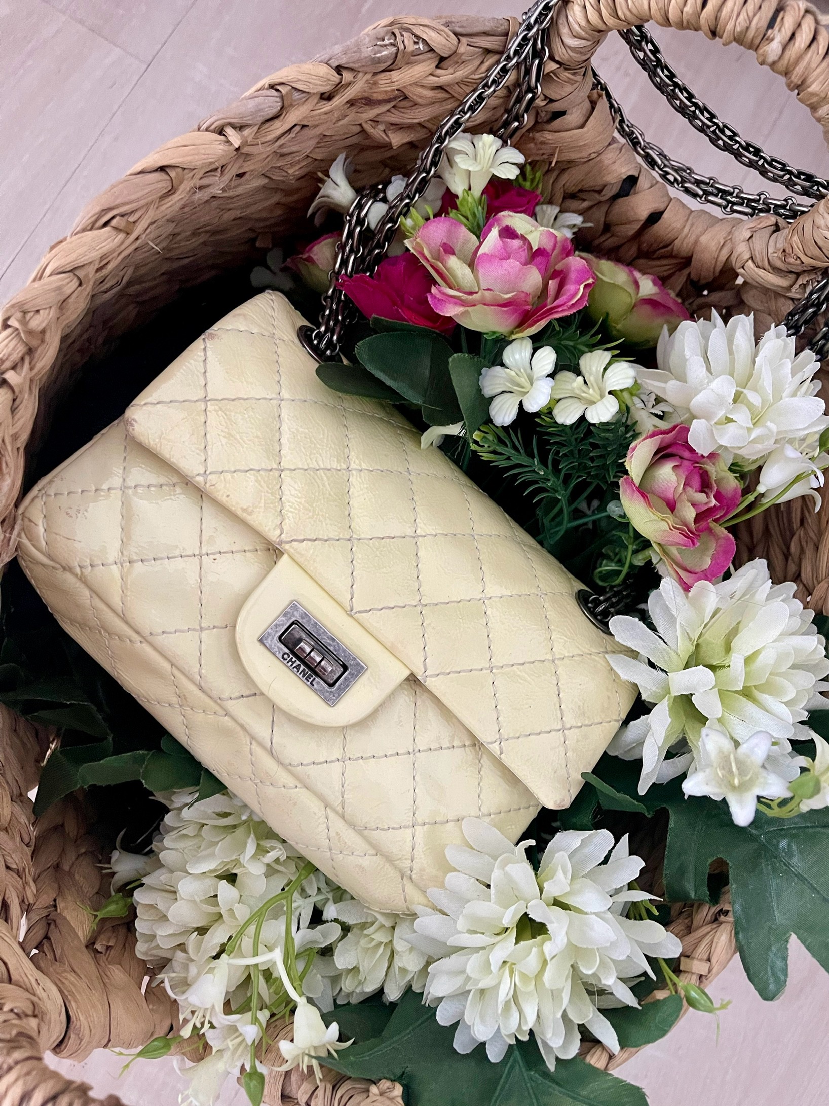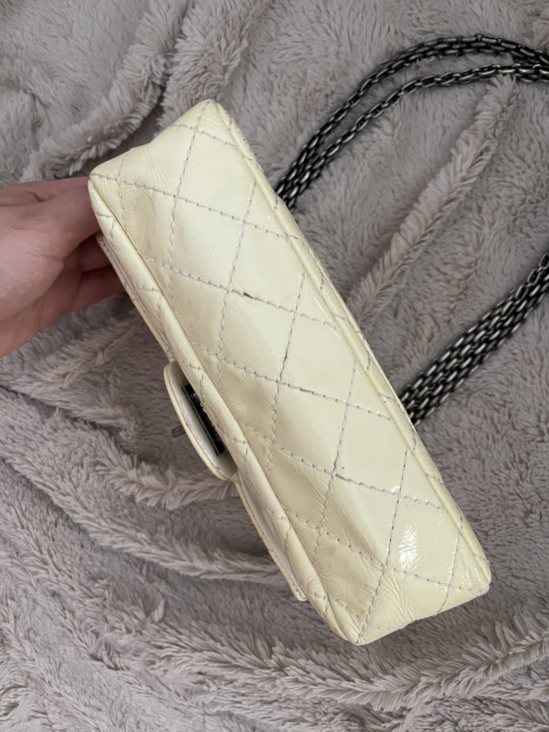 This is an authentic CHANEL Patent Calfskin Quilted 2.55 Reissue Mini Flap in Yellow. This stylish shoulder bag is beautifully crafted of diamond quilted patent calfskin leather in yellow. The bag features a grey reissue chain shoulder strap and a grey Chanel mademoiselle turn-lock. This opens to a double flap white leather interior with zipper and patch pockets.