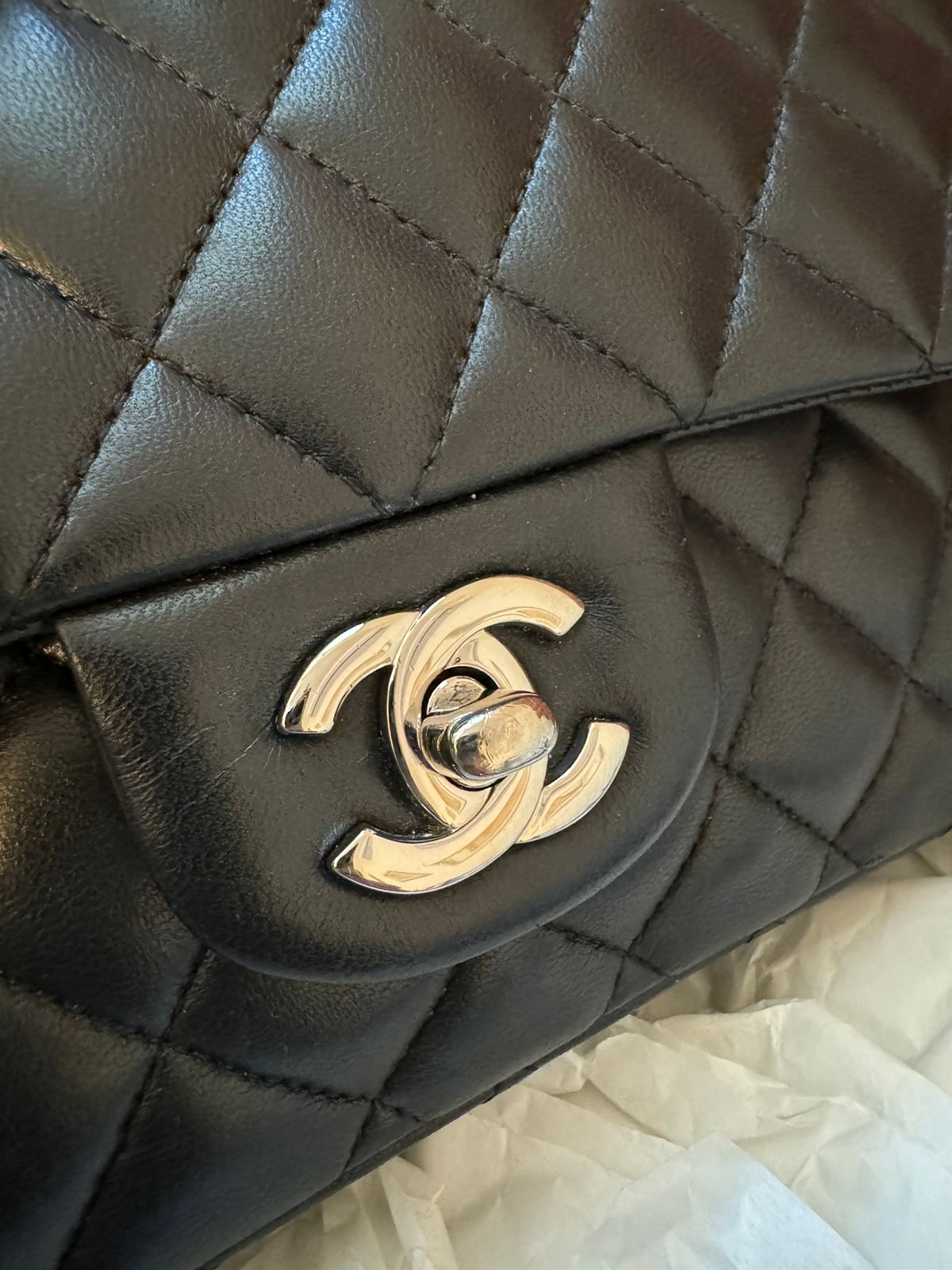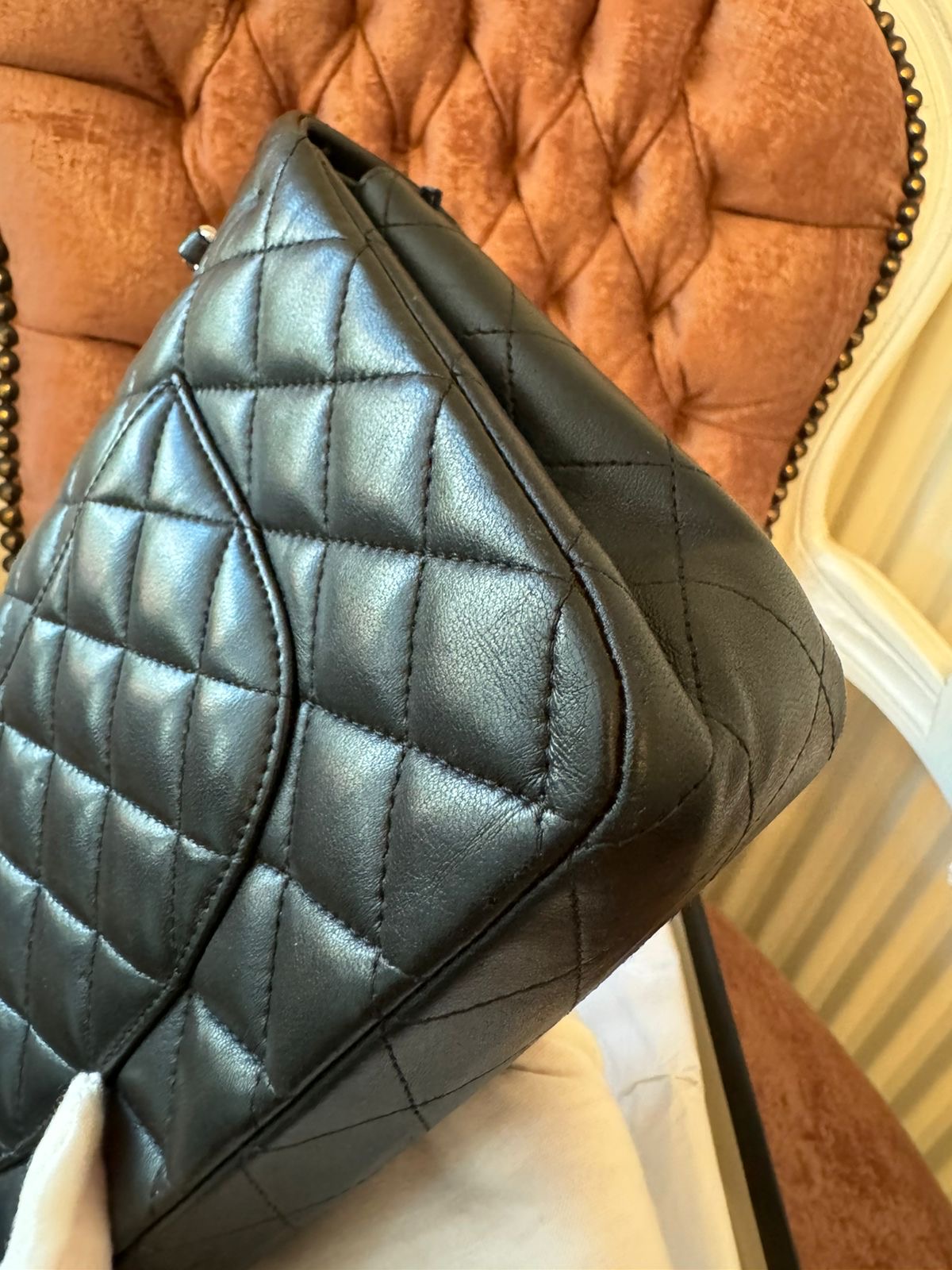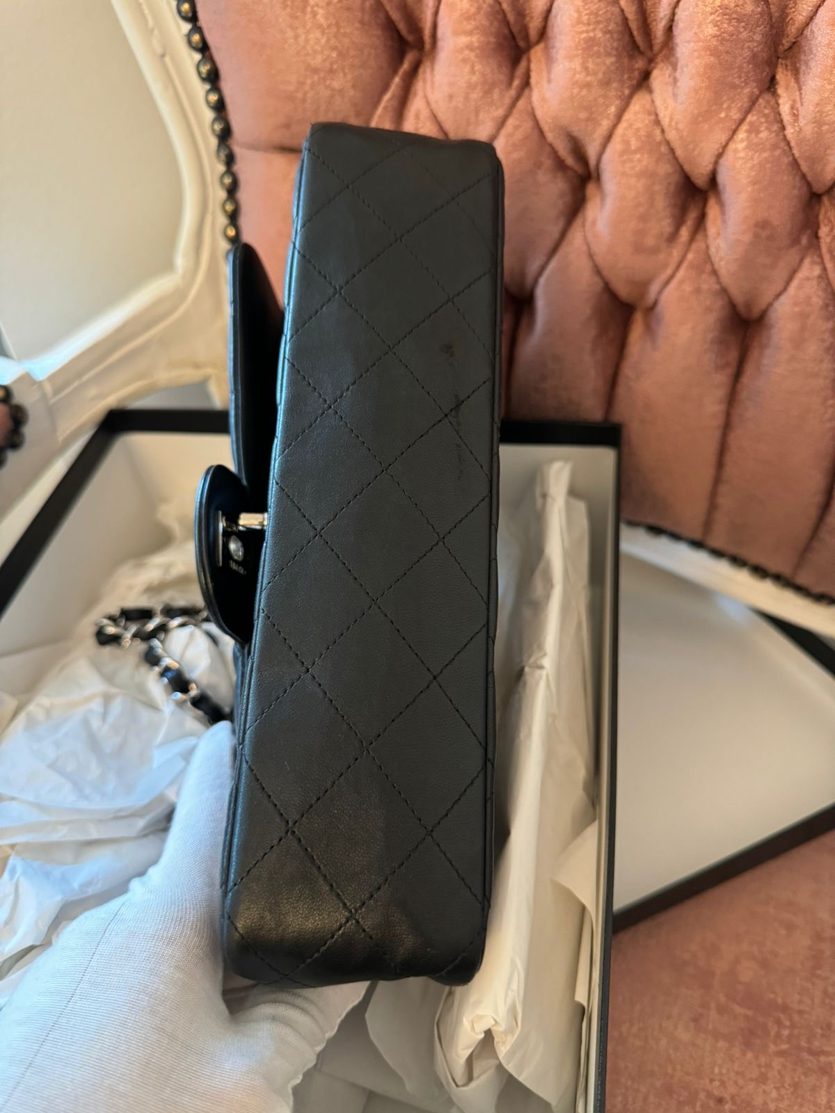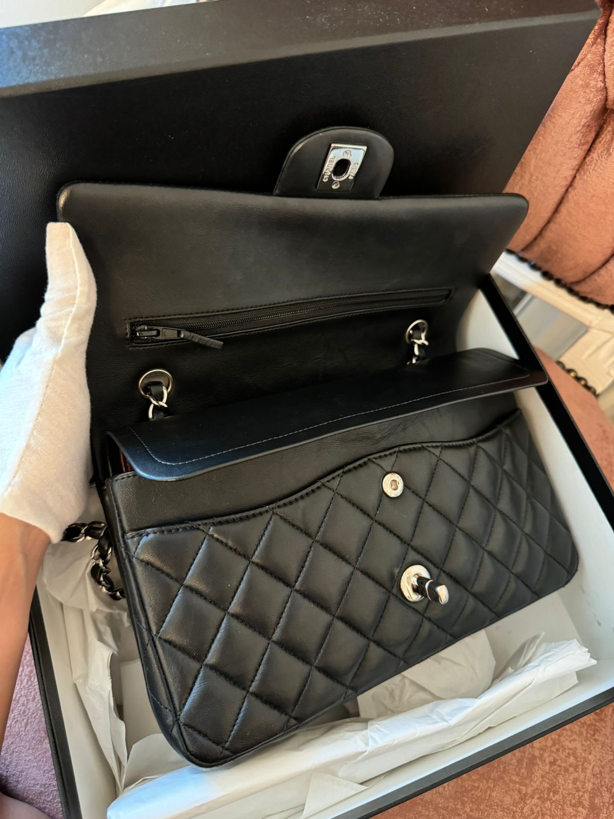 Luxurious Black lambskin leather with silver hardware and burgundy leather lining.
