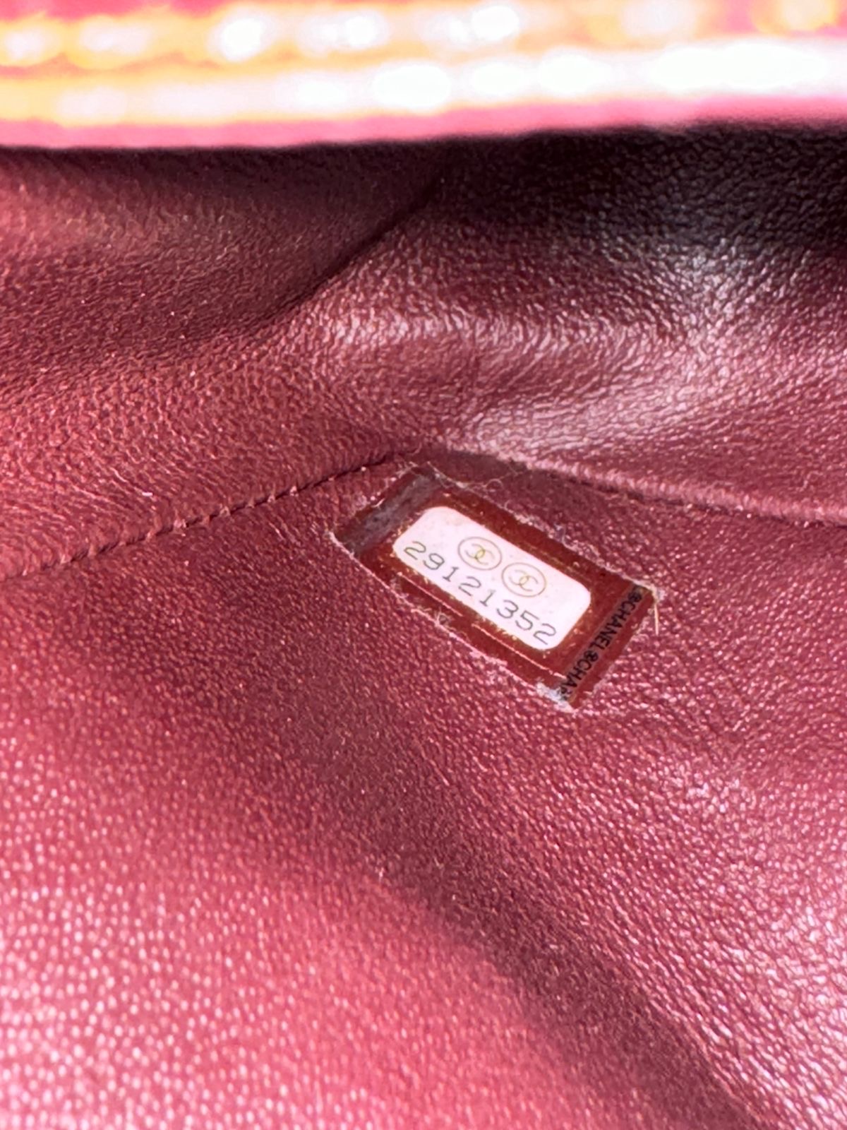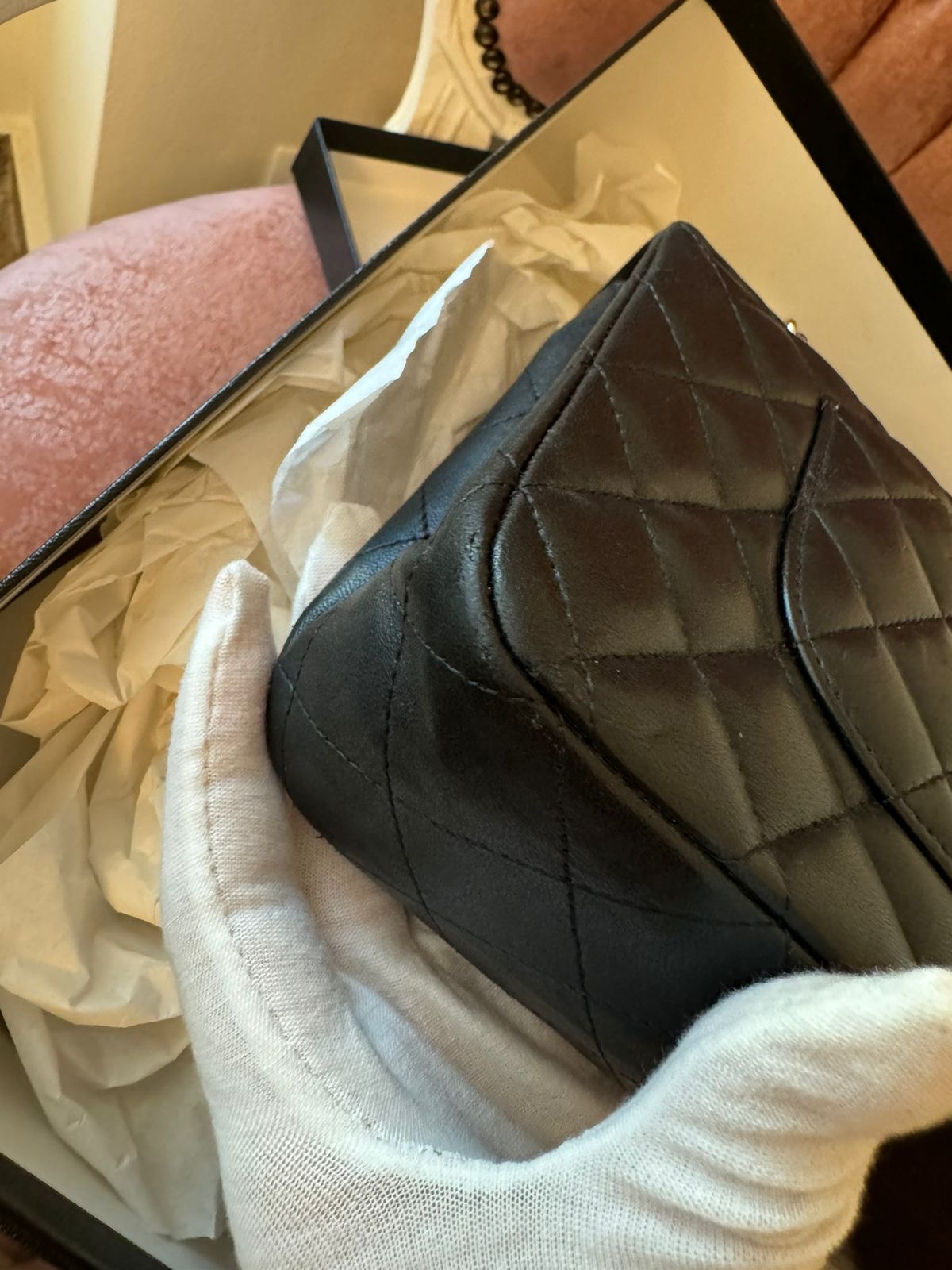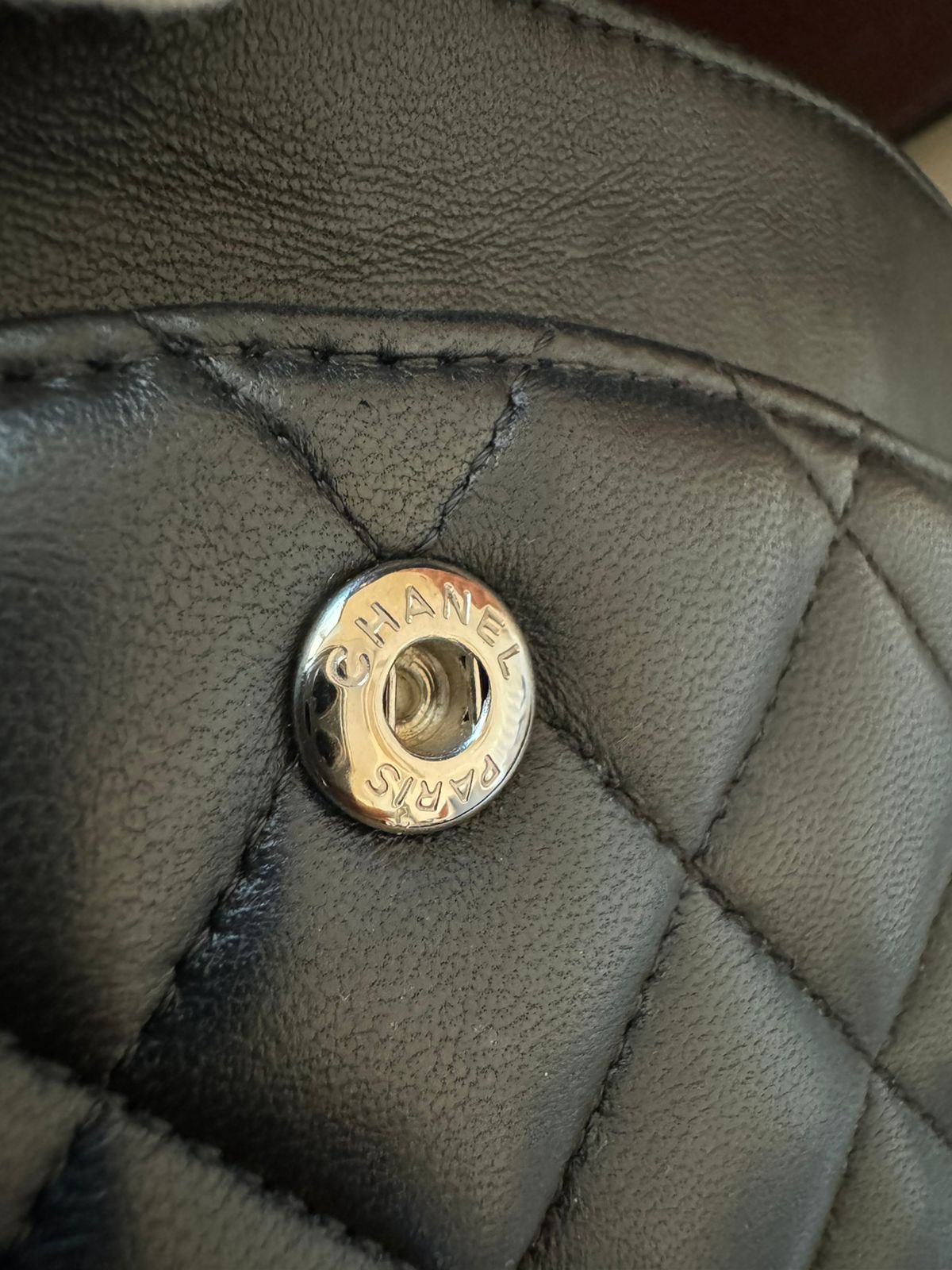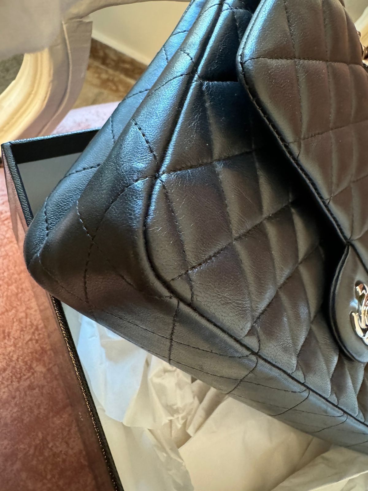 Luxurious Black lambskin leather with silver hardware and burgundy leather lining.