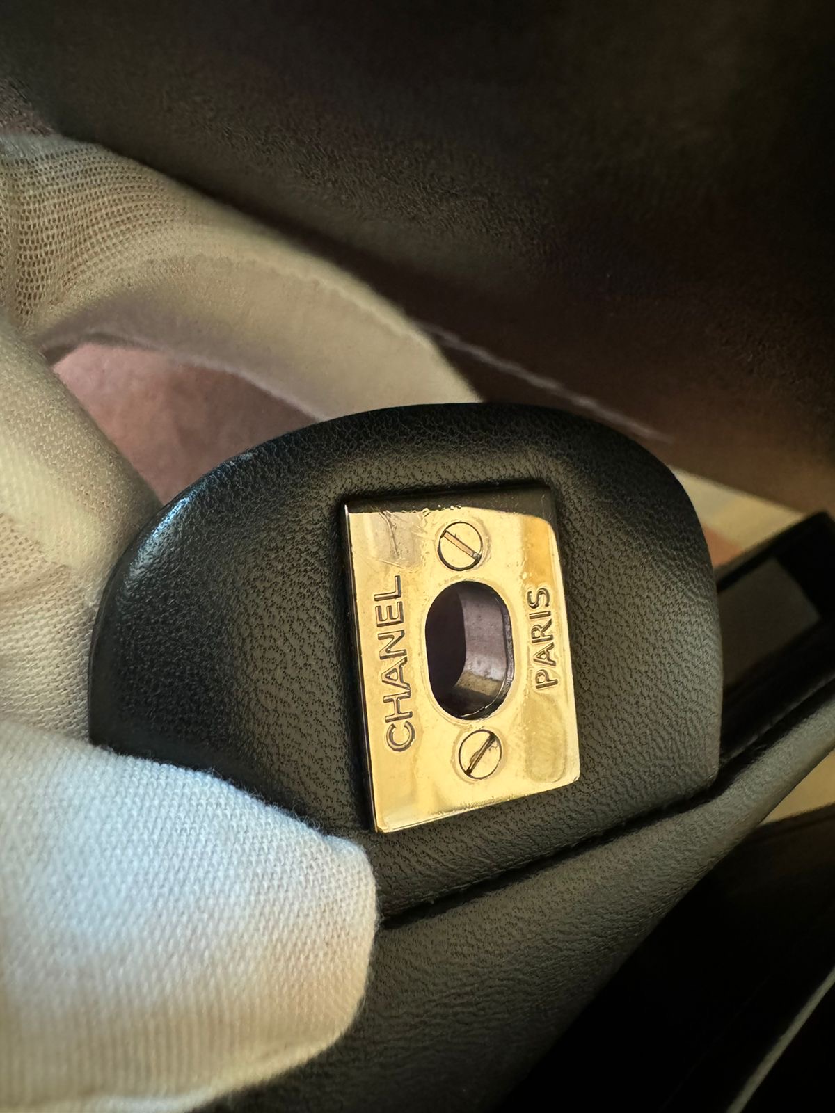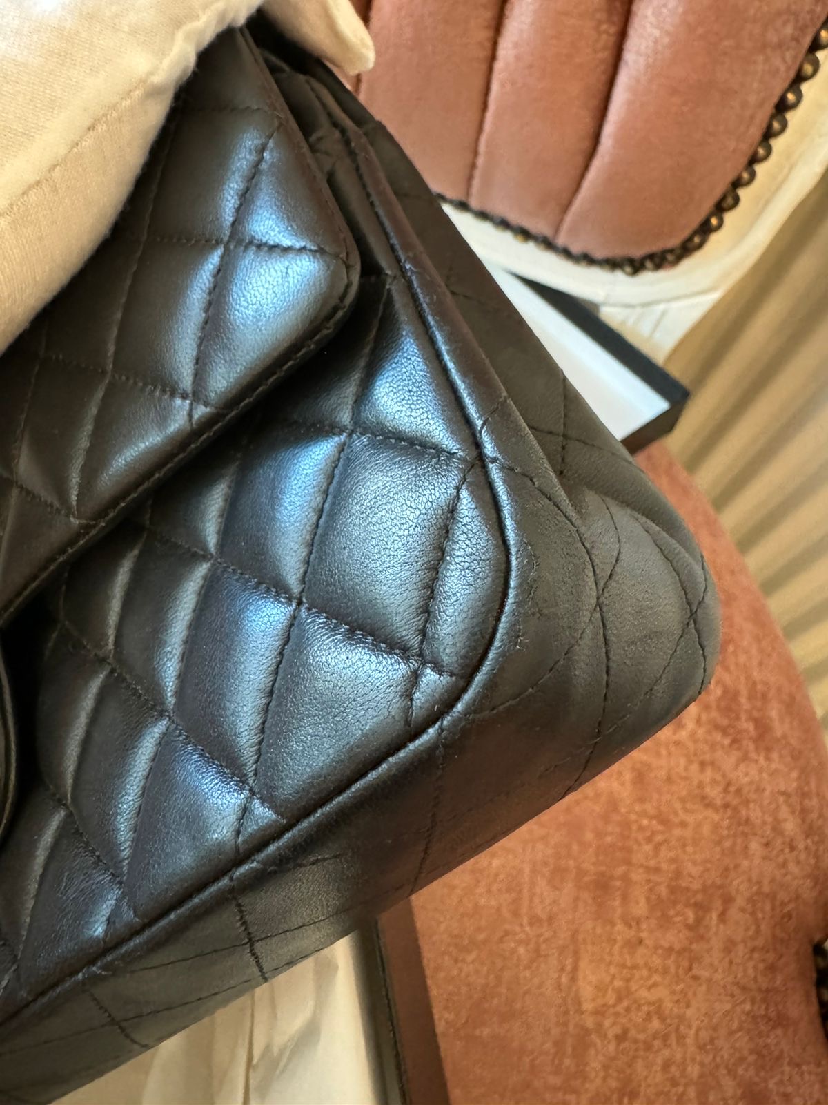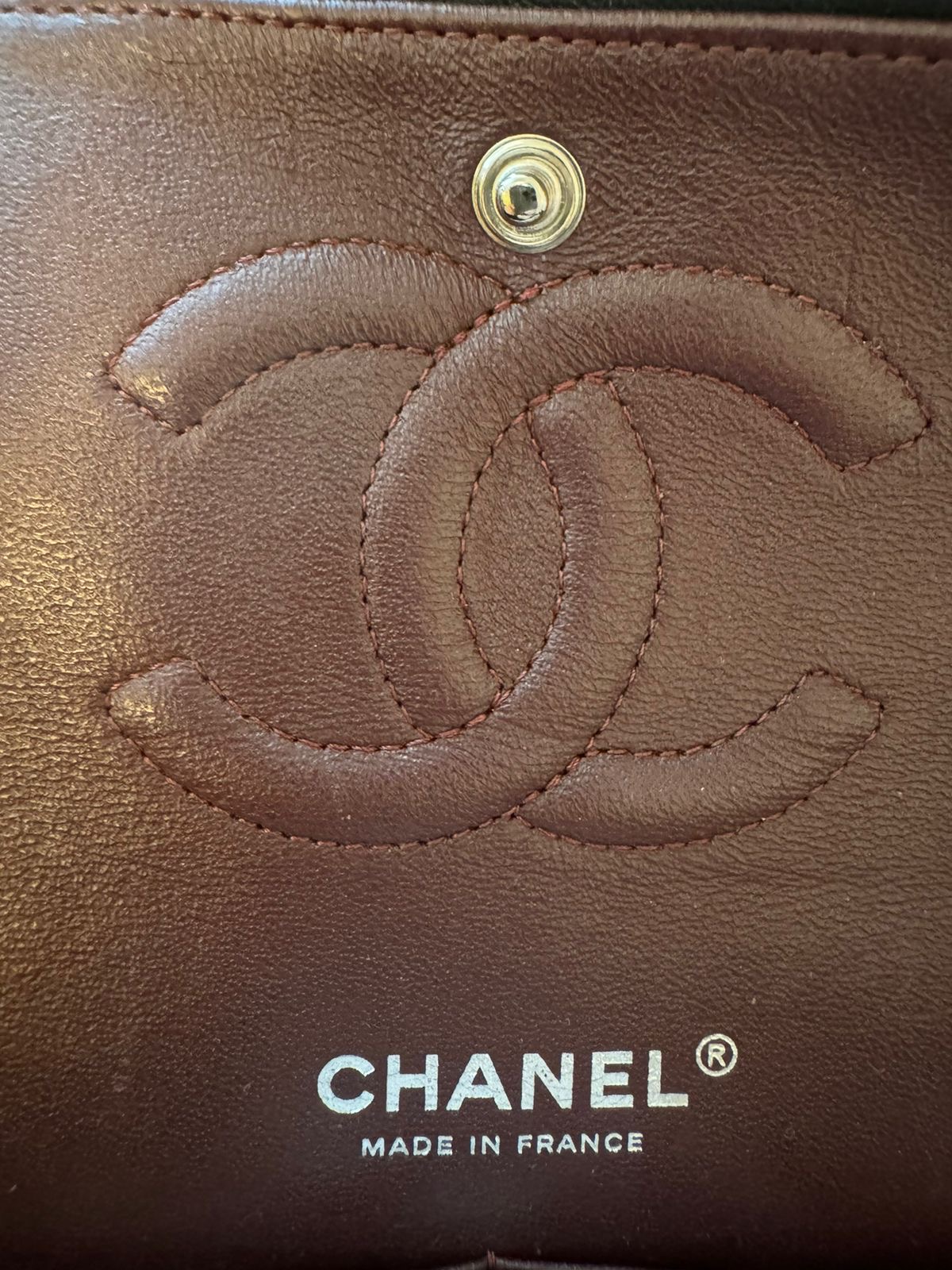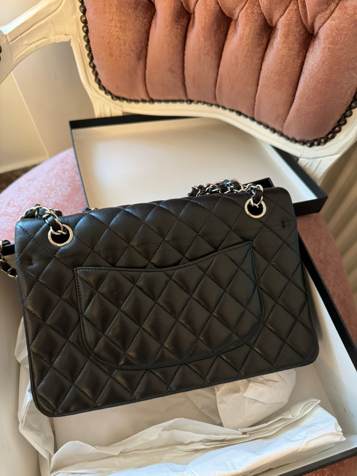 Luxurious Black lambskin leather with silver hardware and burgundy leather lining.