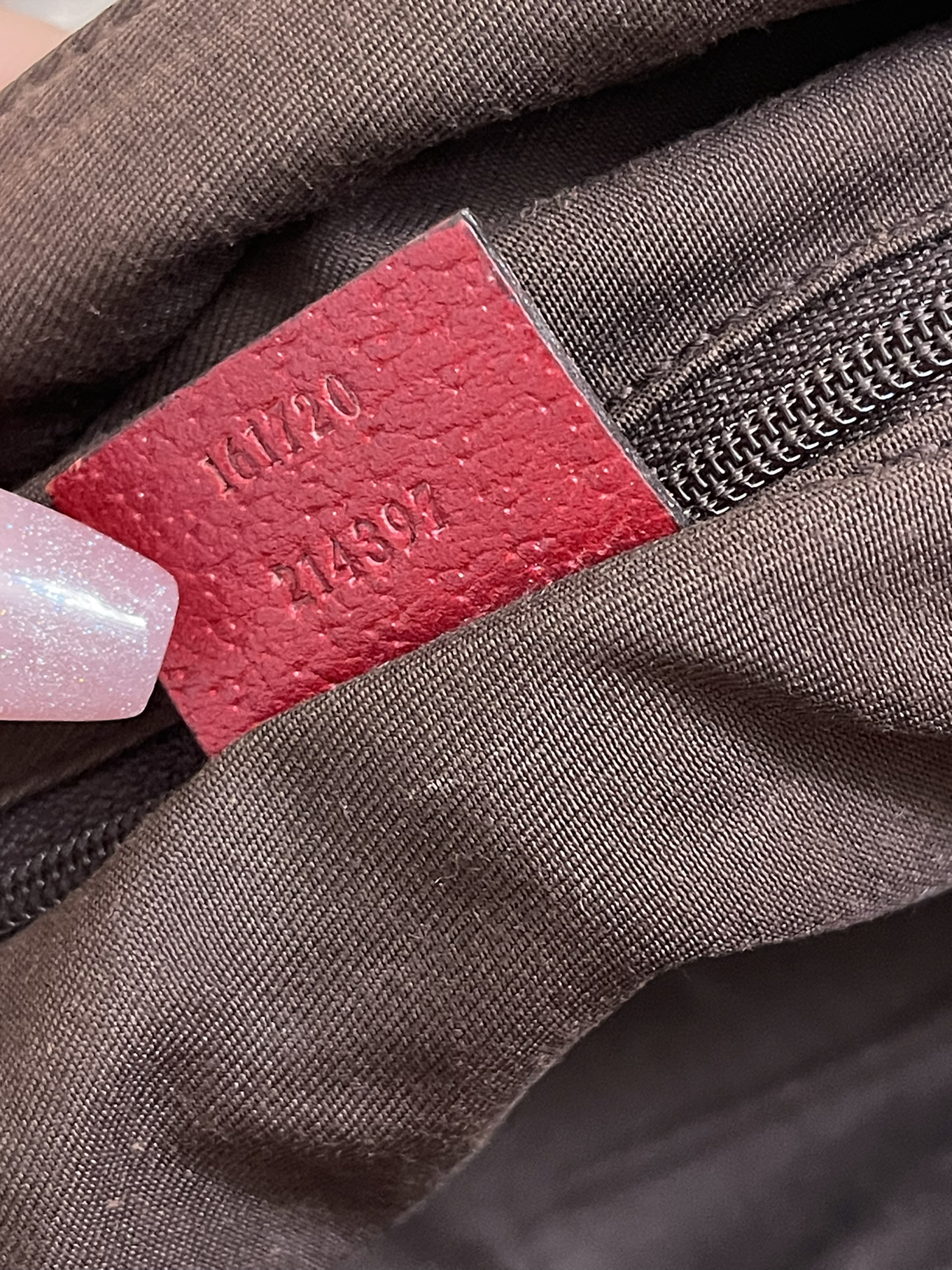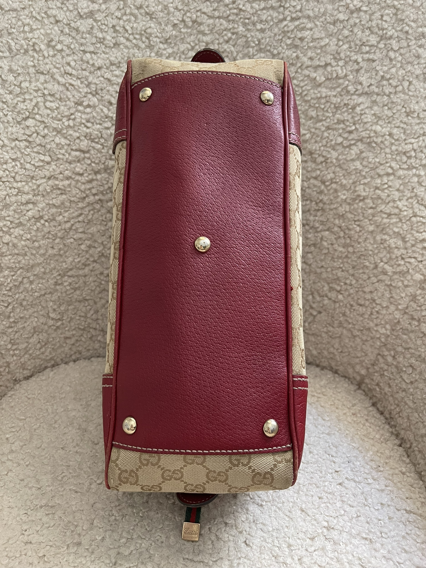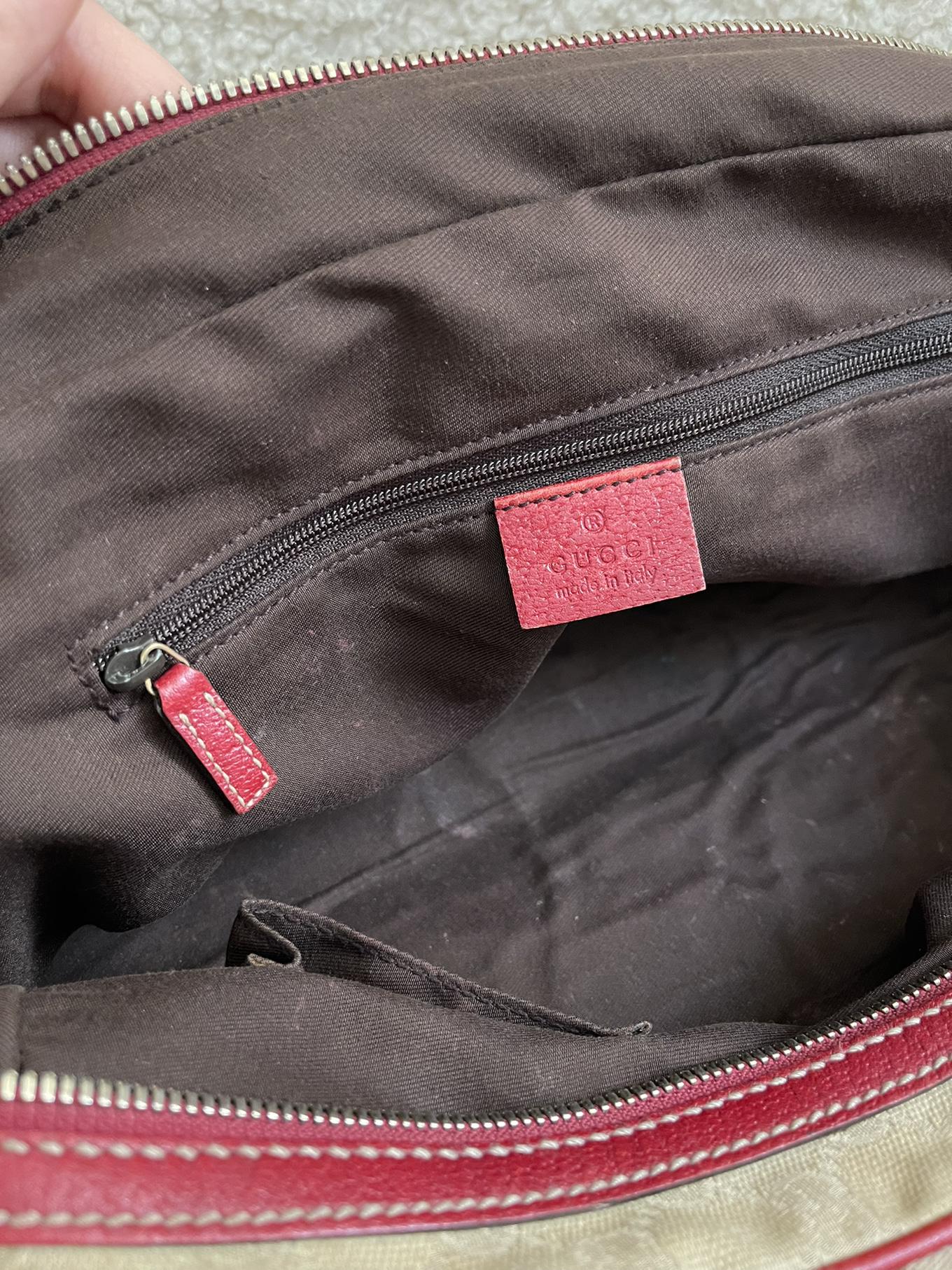 Crafted from GG canvas and leather, this bag from Gucci is designed with minimal style details but with high attention to craftsmanship so that it may assist you with durability. The spacious interior of the bag is lined with fabric and secured by a zipper and the bag is held by two handles.