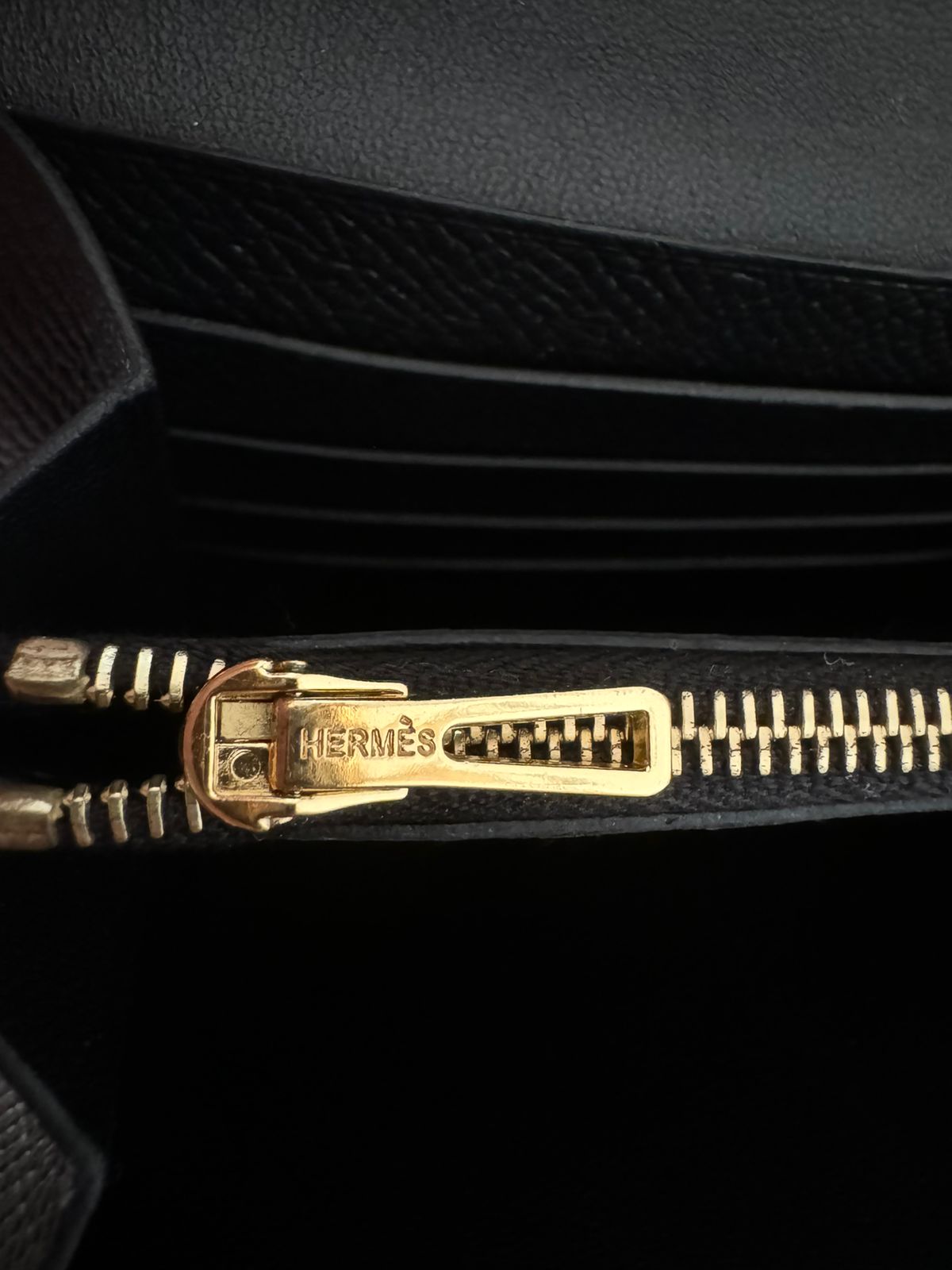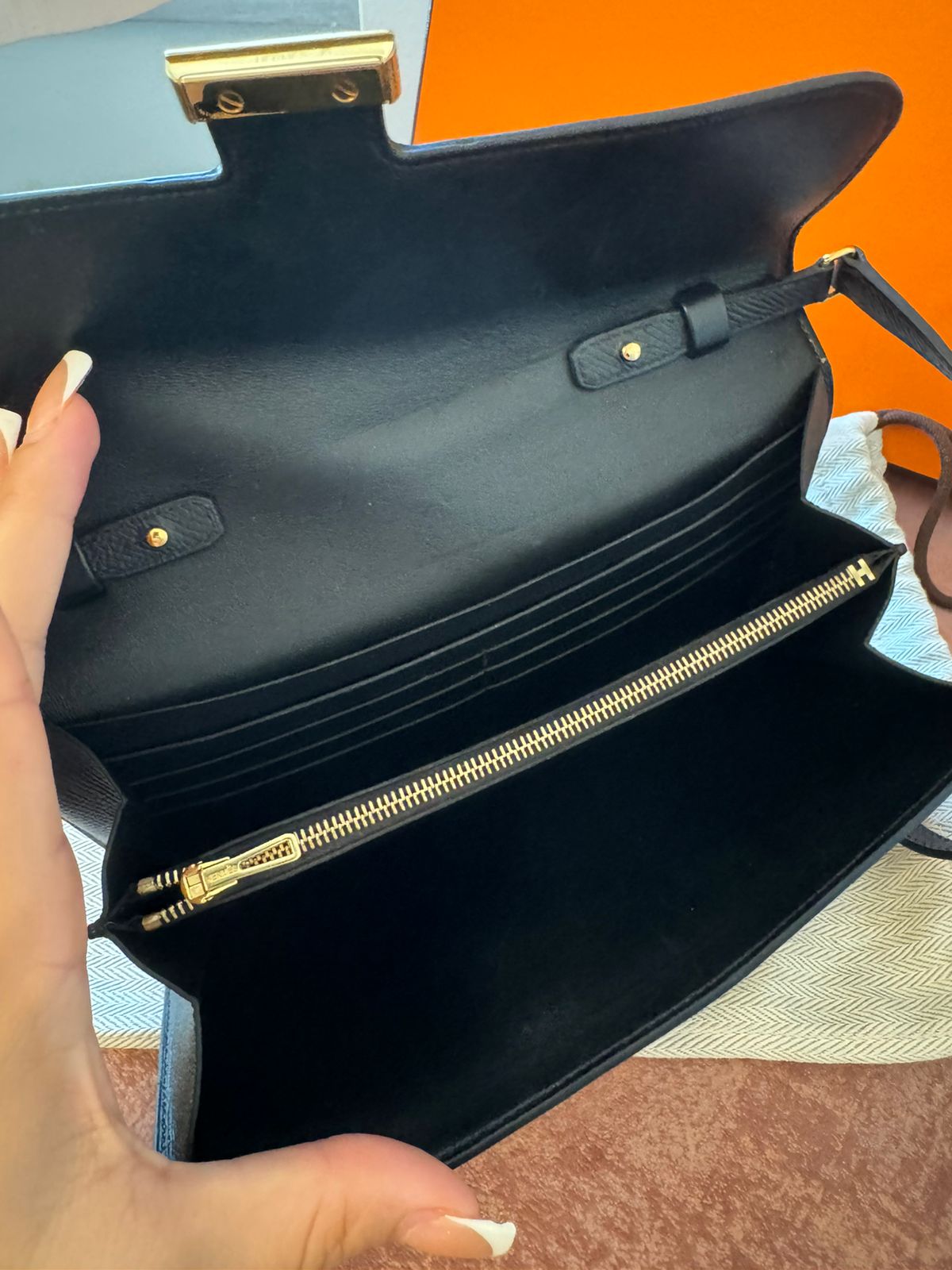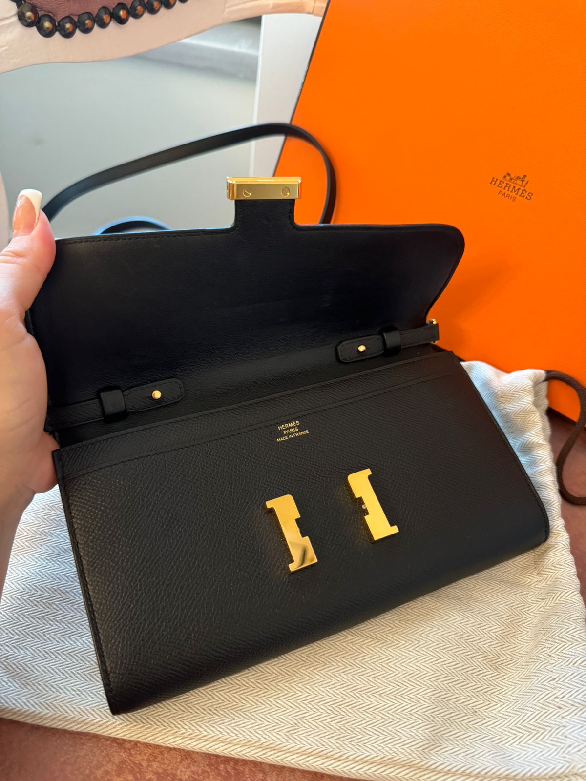 This is a Hermes Constance-To-Go wallet bag. It is made from black epsom leather and lined in tonal leather with rose gold-tone hardware and features a removable strap. The interior is lined with black epsom leather and two main compartments with six credit card slots and a zippered center compartment with Hermes H lock pull.