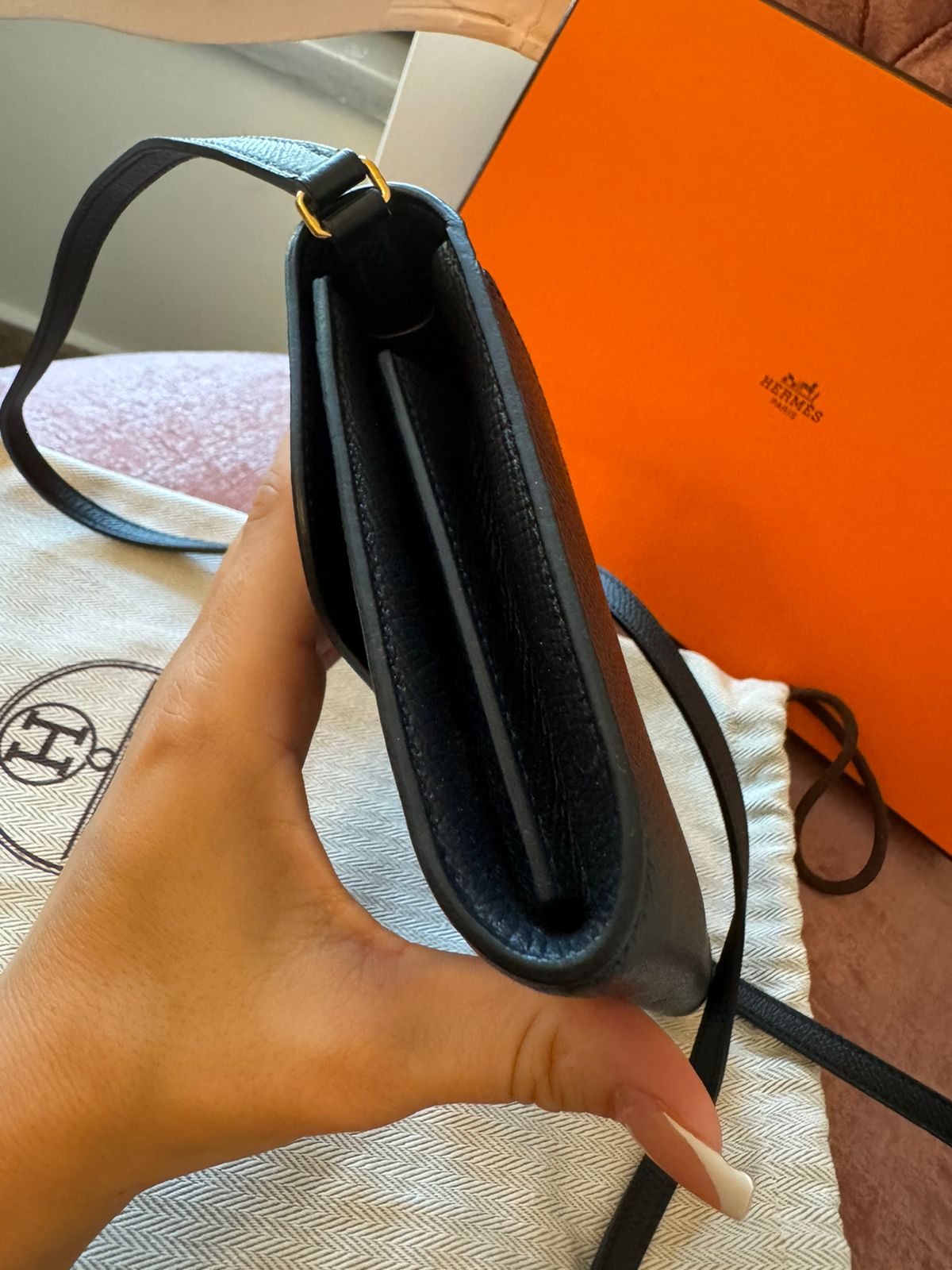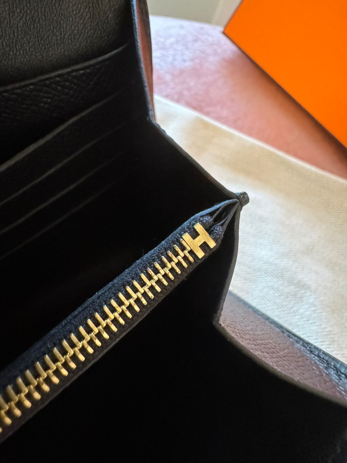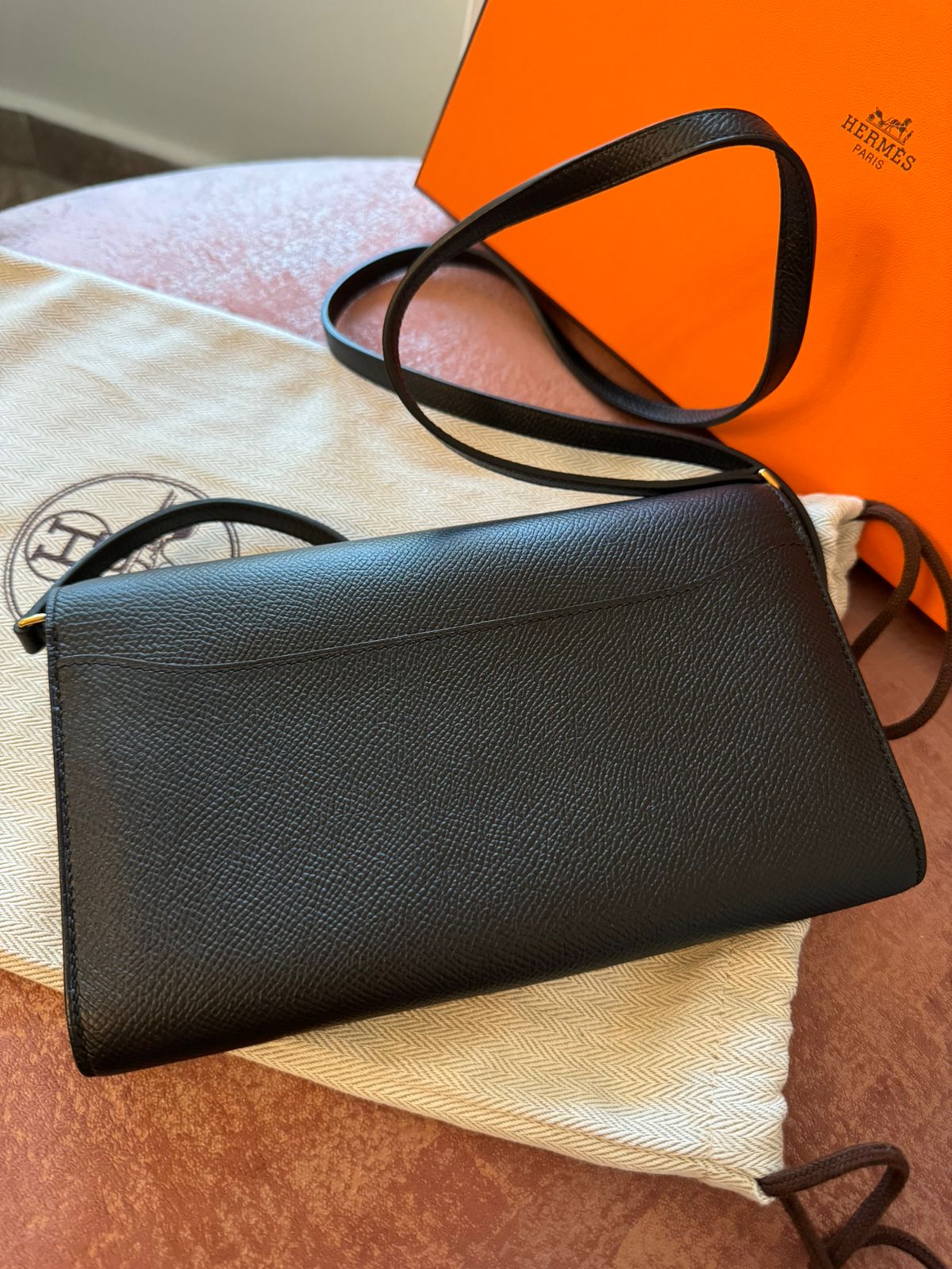 This is a Hermes Constance-To-Go wallet bag. It is made from black epsom leather and lined in tonal leather with rose gold-tone hardware and features a removable strap. The interior is lined with black epsom leather and two main compartments with six credit card slots and a zippered center compartment with Hermes H lock pull.