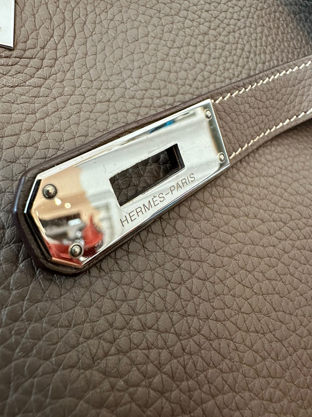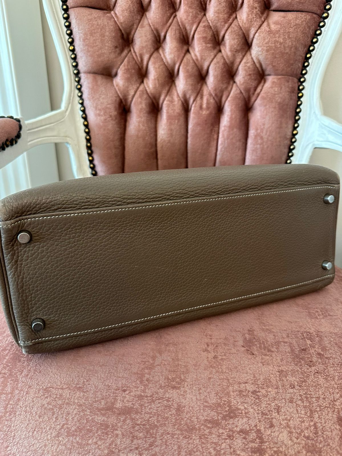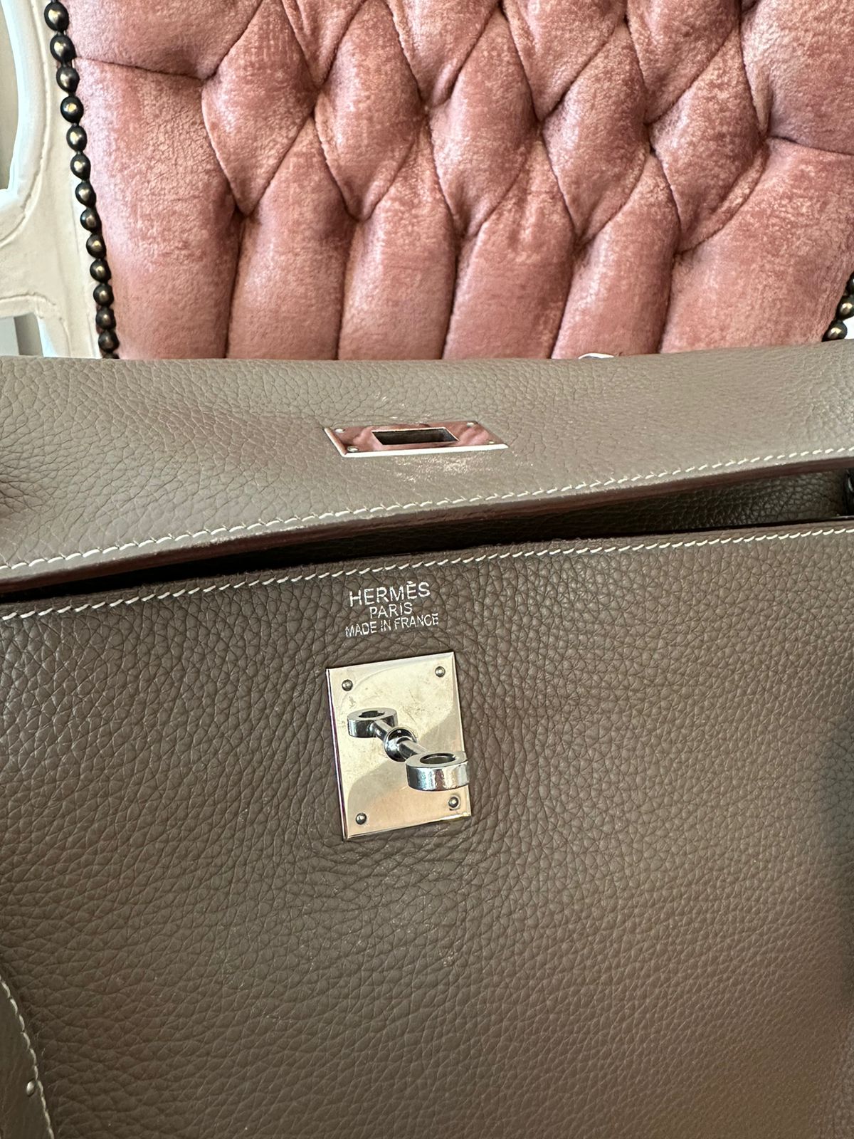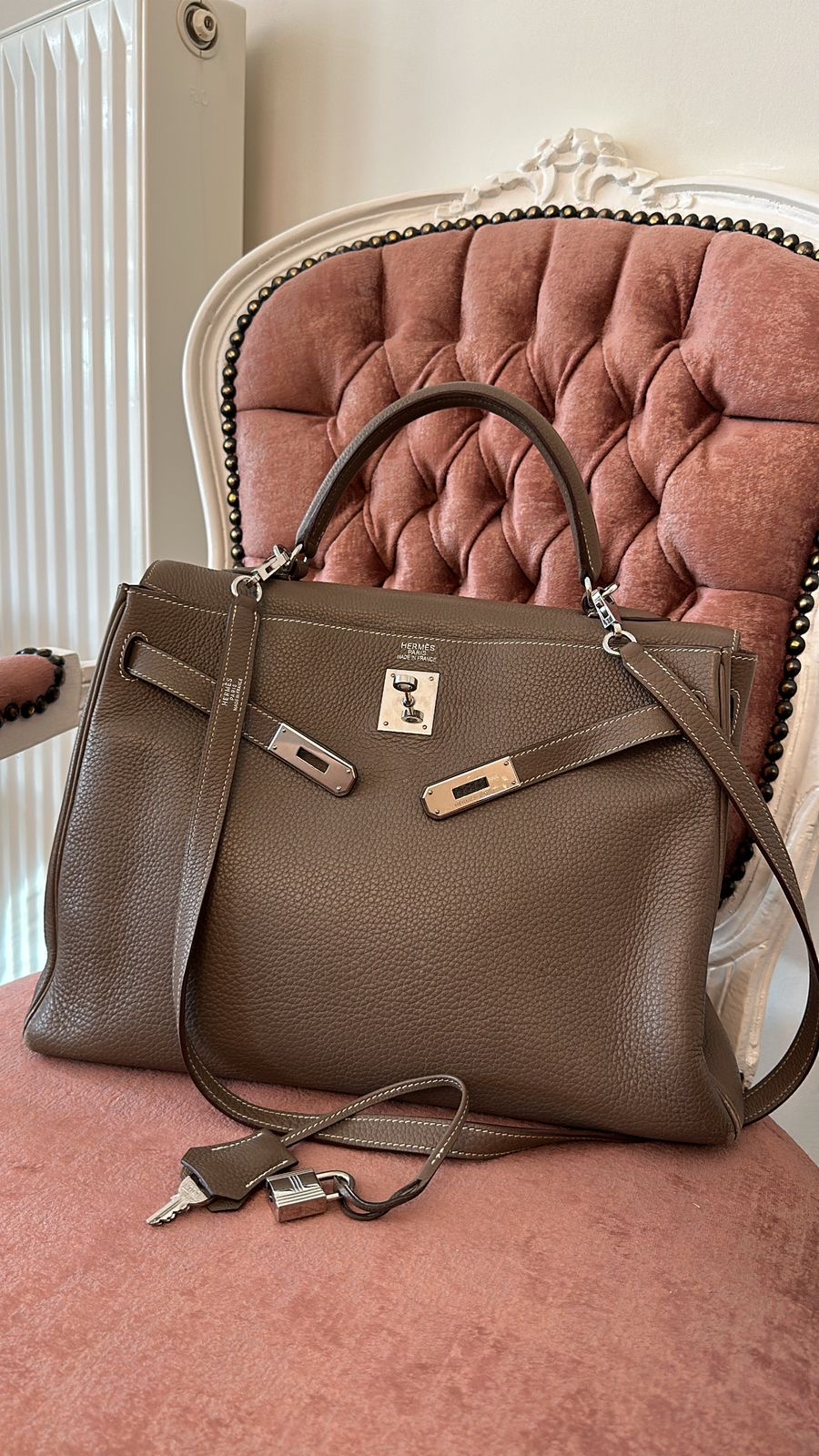 This is an authentic HERMES Taurillon Clemence Kelly Retourne 35 in Etoupe. This chic Kelly handbag is crafted of rich grained calfskin leather in neutral taupe. The bag features a reinforced rolled leather top handle with palladium plated links, an optional shoulder strap with silver palladiium clasps, a crossover flap and strap closure, and a signature Kelly turn lock. The flap opens to a matte leather interior with a zipper and flat pockets.