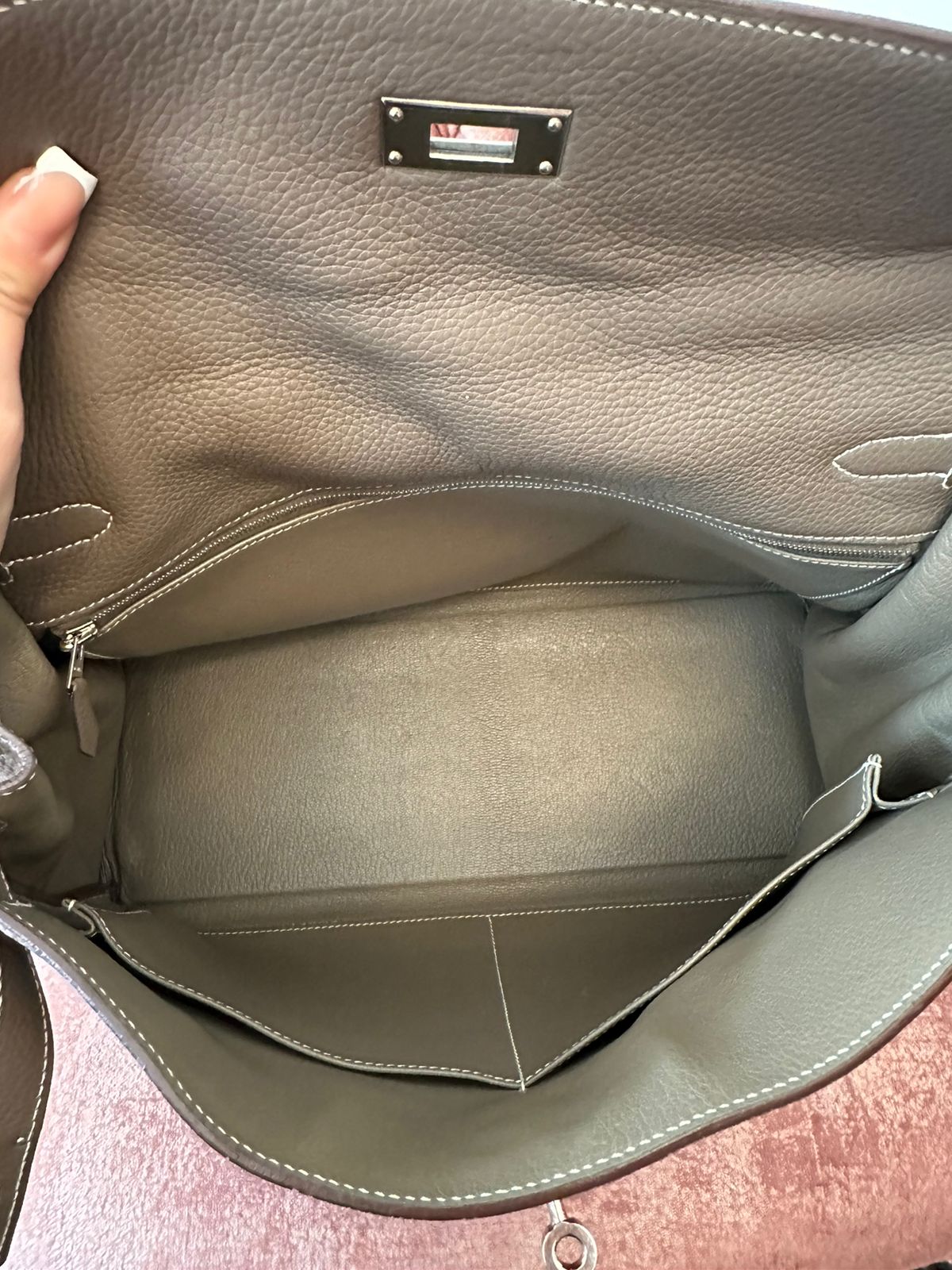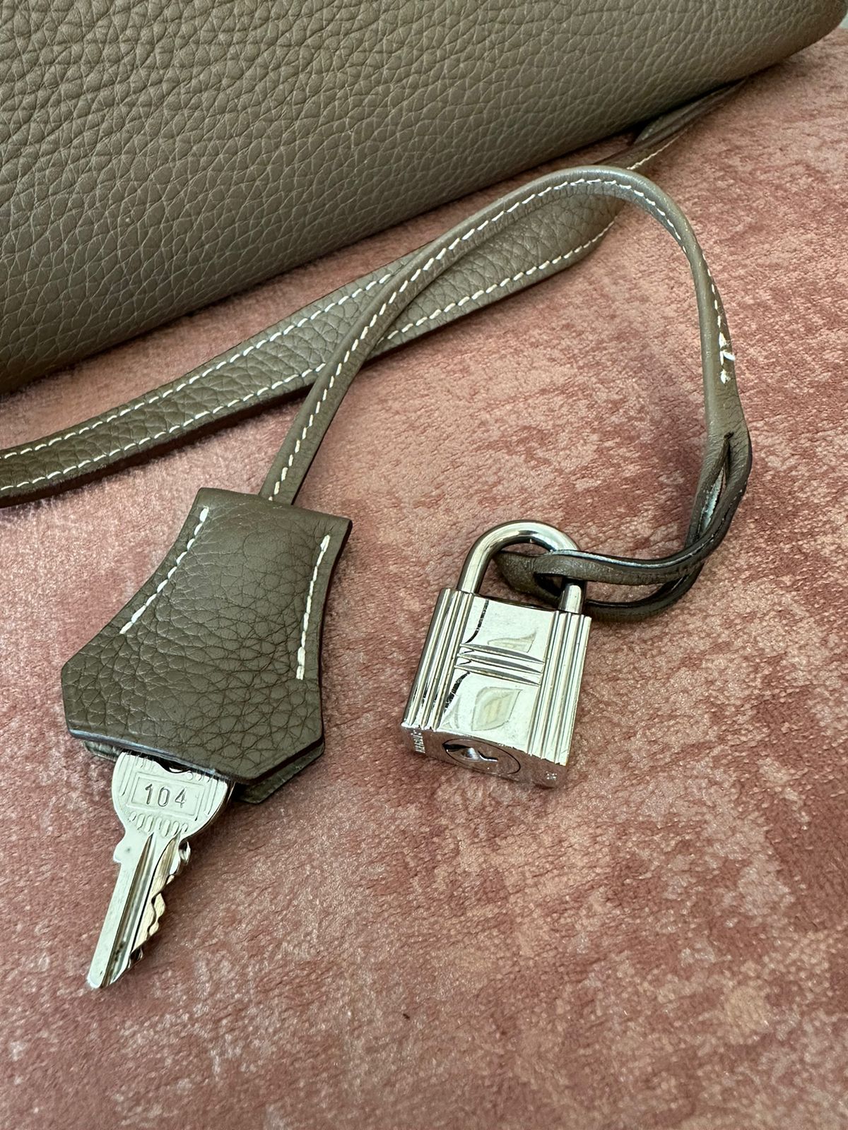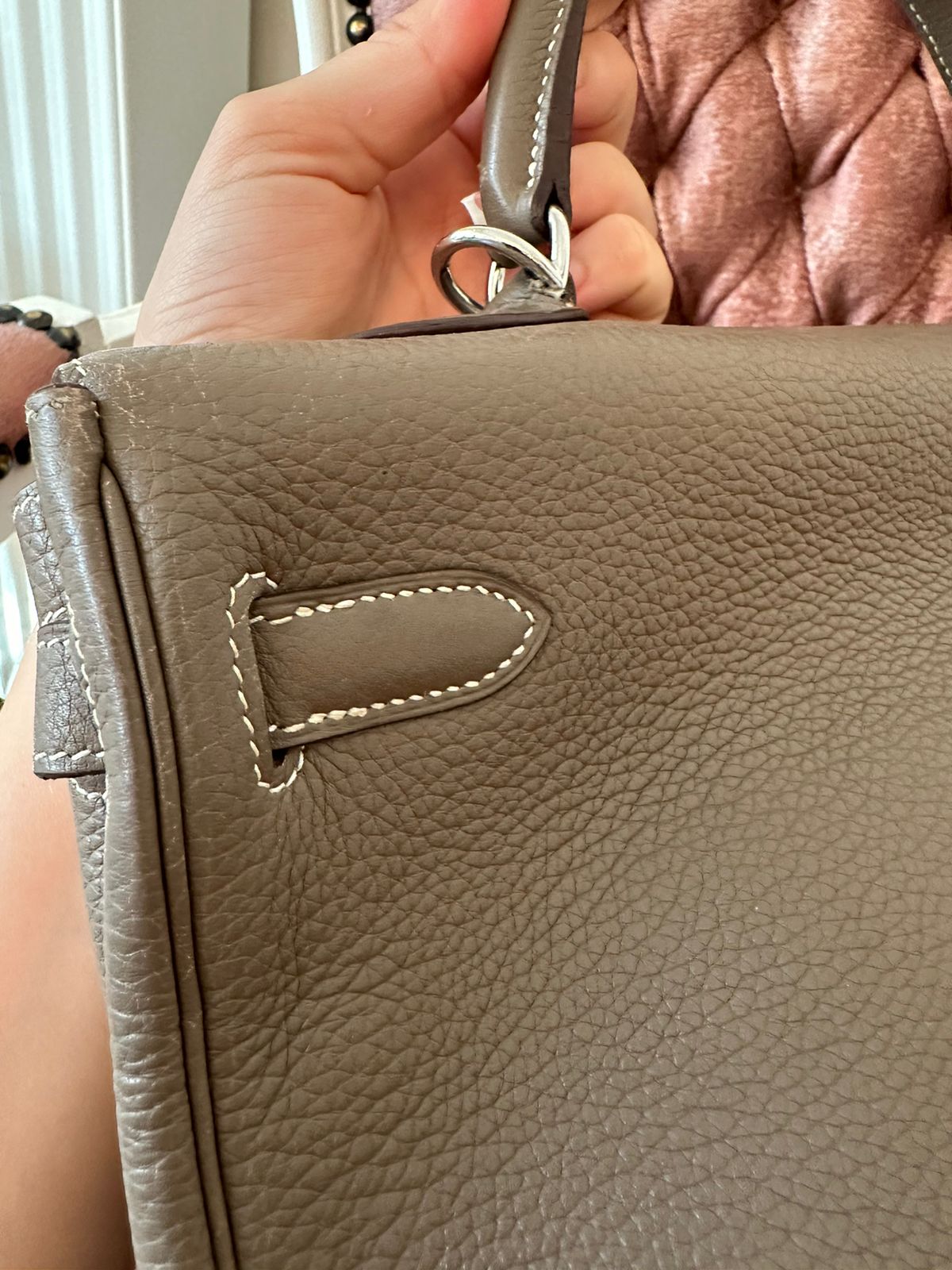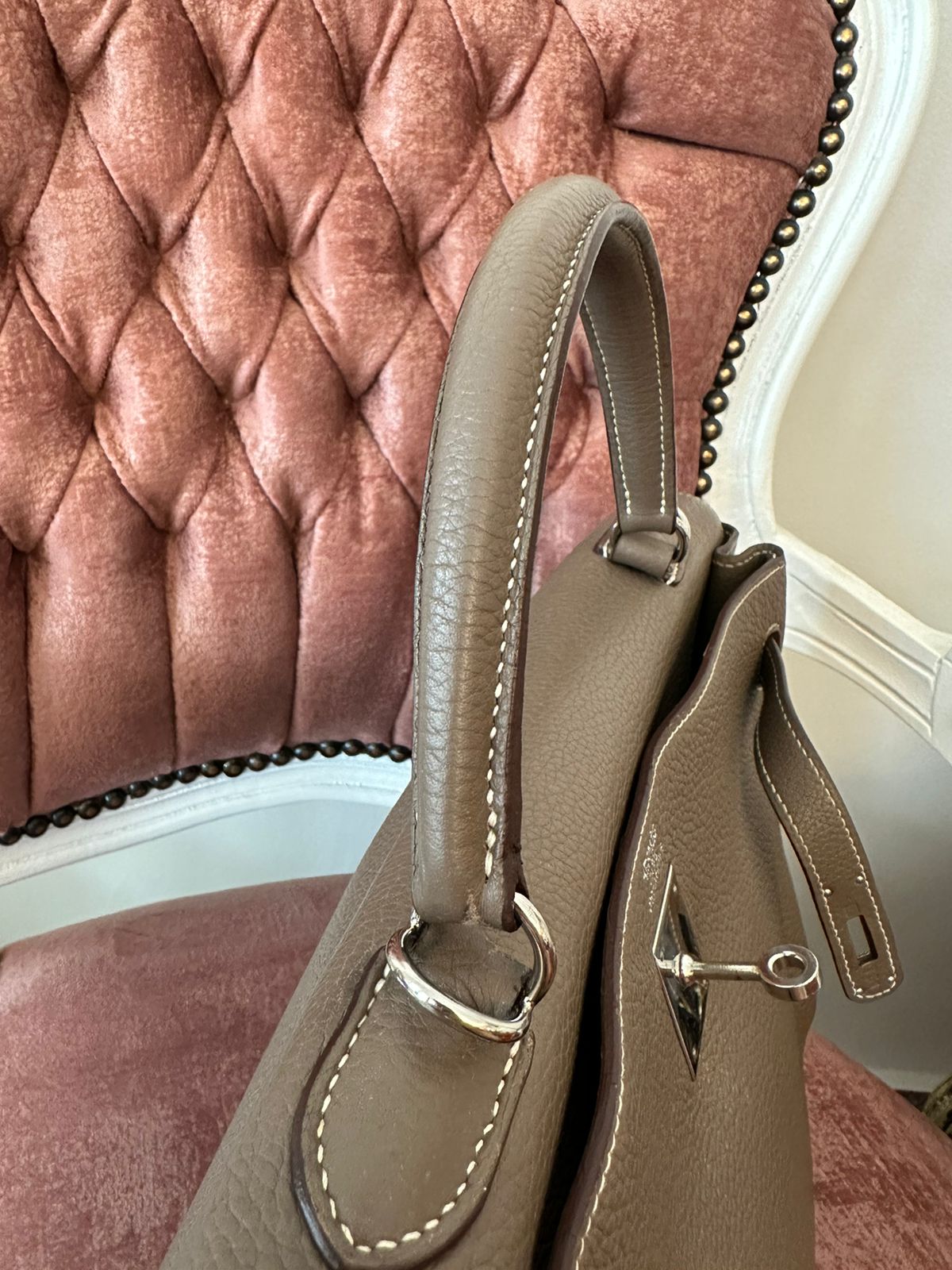 This is an authentic HERMES Taurillon Clemence Kelly Retourne 35 in Etoupe. This chic Kelly handbag is crafted of rich grained calfskin leather in neutral taupe. The bag features a reinforced rolled leather top handle with palladium plated links, an optional shoulder strap with silver palladiium clasps, a crossover flap and strap closure, and a signature Kelly turn lock. The flap opens to a matte leather interior with a zipper and flat pockets.