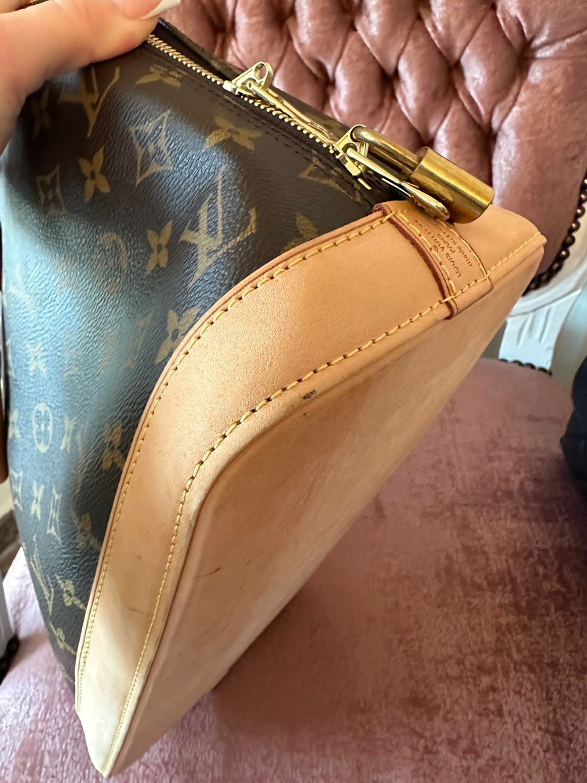 This handbag is crafted of a durable Louis Vuitton monogram toile canvas. The handbag features rolled vachetta leather handles, a vachetta base, and polished brass hardware. The wrap-around zipper opens to a brown fabric interior with a flat pocket.