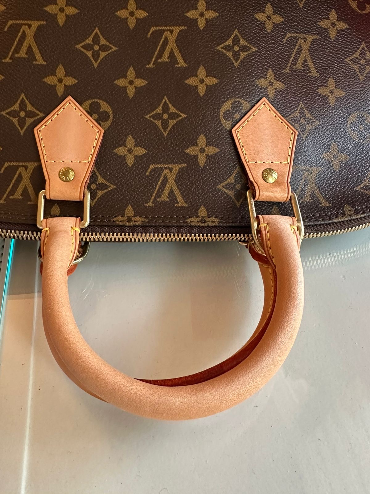 Handle: Edge wear, patina of vachetta, marks