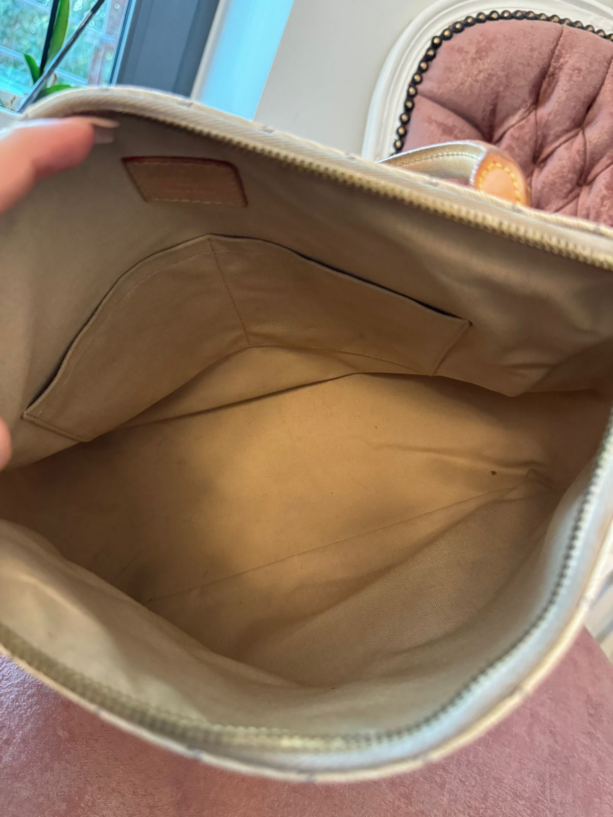 The exterior coated canvas is clean but has some rubbing to the bottom corners and along the opening of the outer pockets. The leather trim and handles have developed a light patina, but does have water spots and some scuffing. The leather trim shows light wear and light rubbing especially to the side tabs. The handles show light wear and darkening to the leather. The goldtone hardware has light surface scratches, but is still bright. Zipper Rusty/tarnished, scratched.The interior lining has light signs of wear, rubbing and soiling.