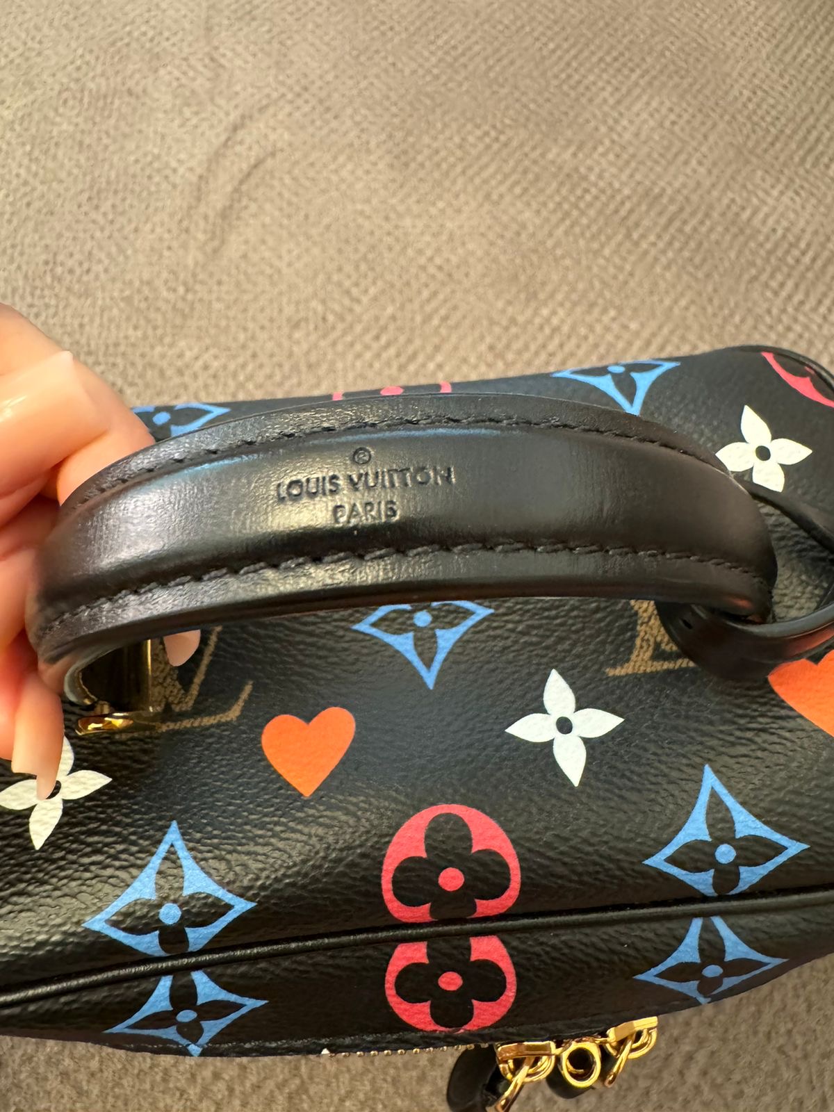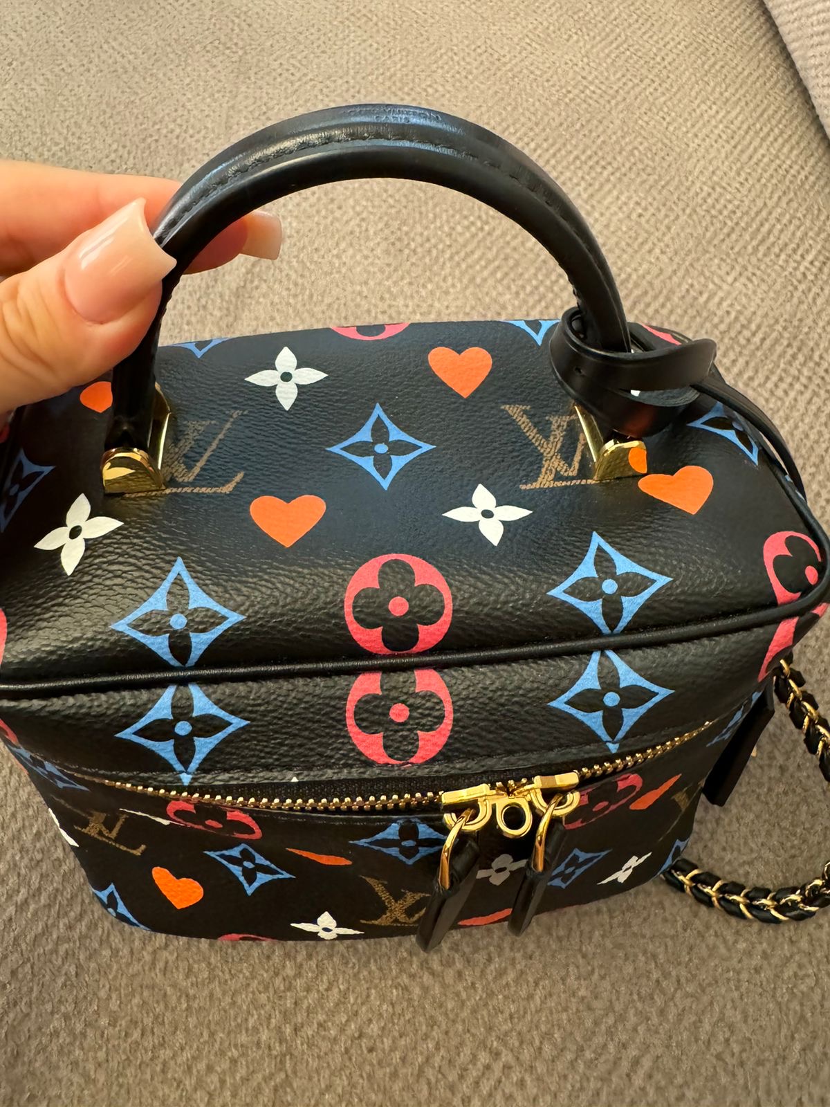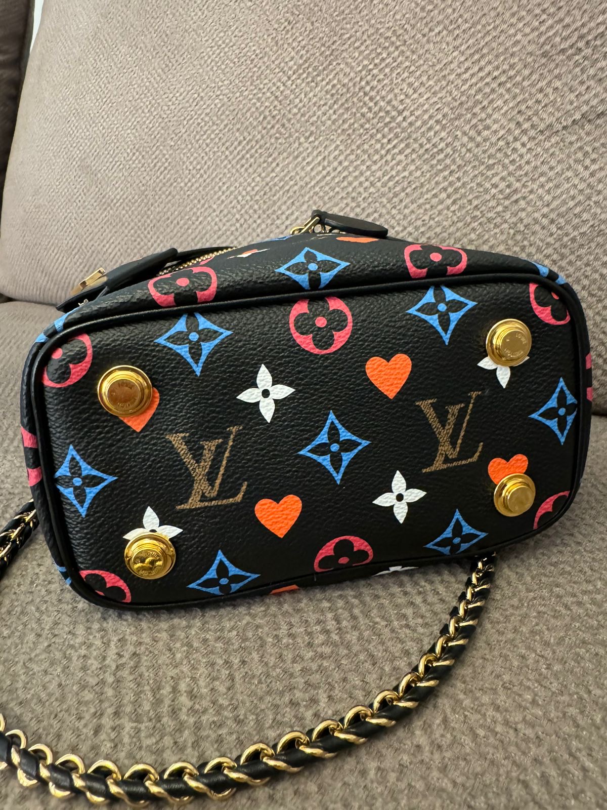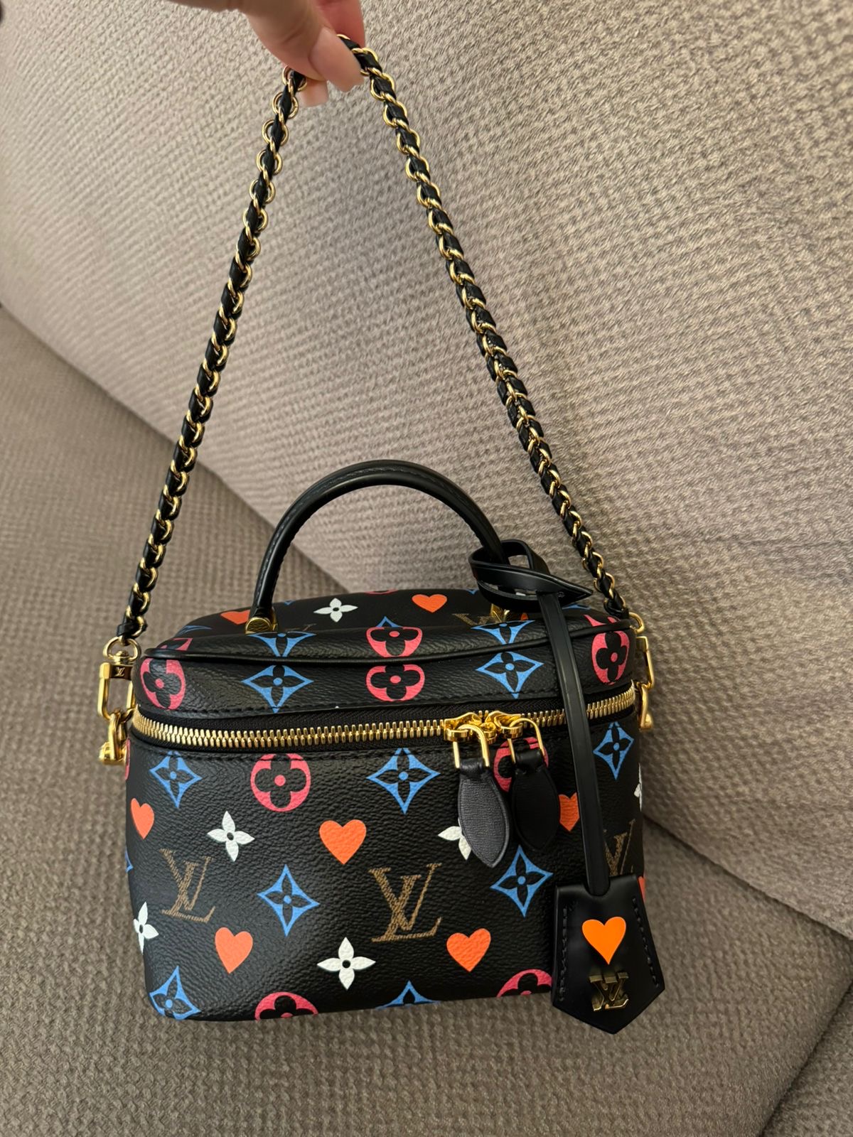 This stylish vanity case is part of Louis Vuitton’s Cruise 2021 Collection, which plays with Louis Vuitton’s iconic motif, mingling Monogram symbols with the four suits of a deck of cards. The bag features black cowhide leather trim, a matching handle, and an optional leather-threaded gold chain-link shoulder strap. The wrap-around zipper opens to a black microfiber interior with a small patch pocket.