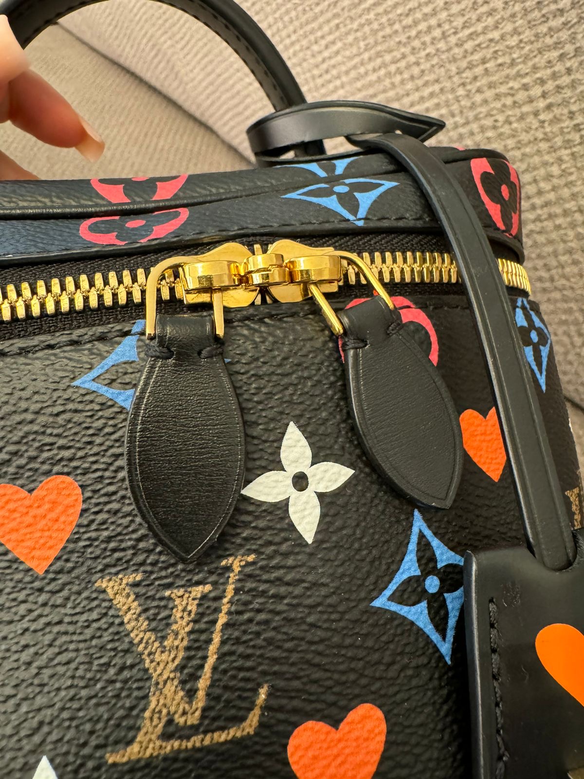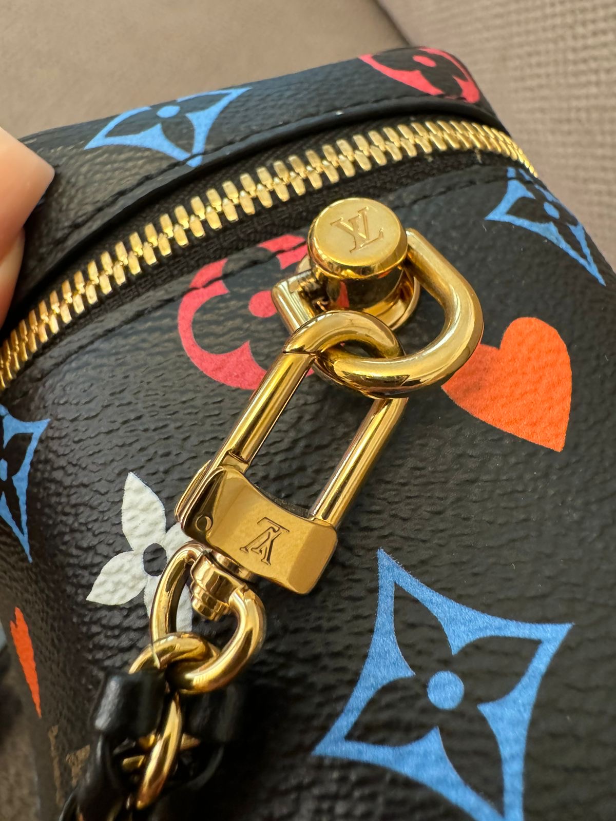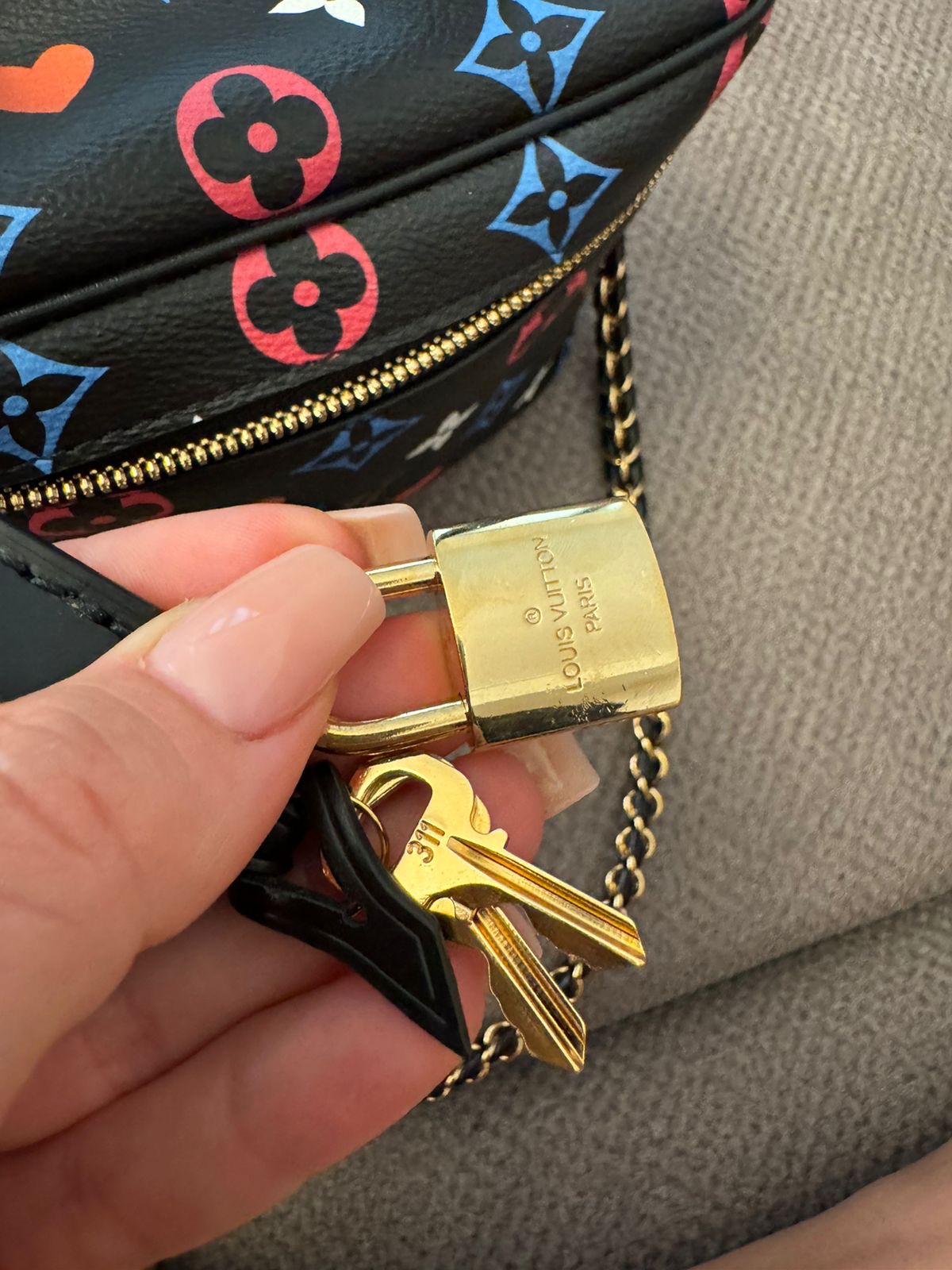 This stylish vanity case is part of Louis Vuitton’s Cruise 2021 Collection, which plays with Louis Vuitton’s iconic motif, mingling Monogram symbols with the four suits of a deck of cards. The bag features black cowhide leather trim, a matching handle, and an optional leather-threaded gold chain-link shoulder strap. The wrap-around zipper opens to a black microfiber interior with a small patch pocket.