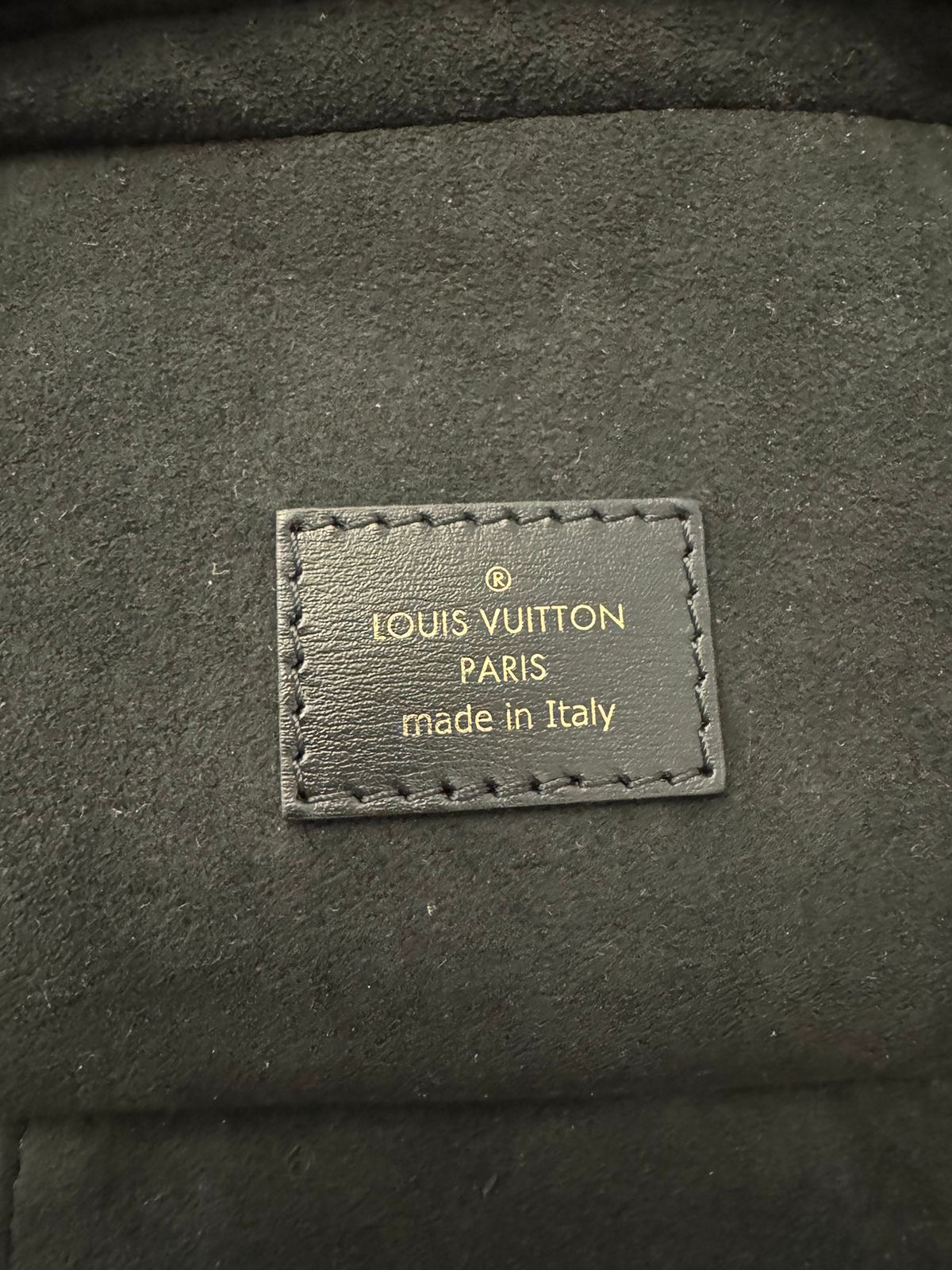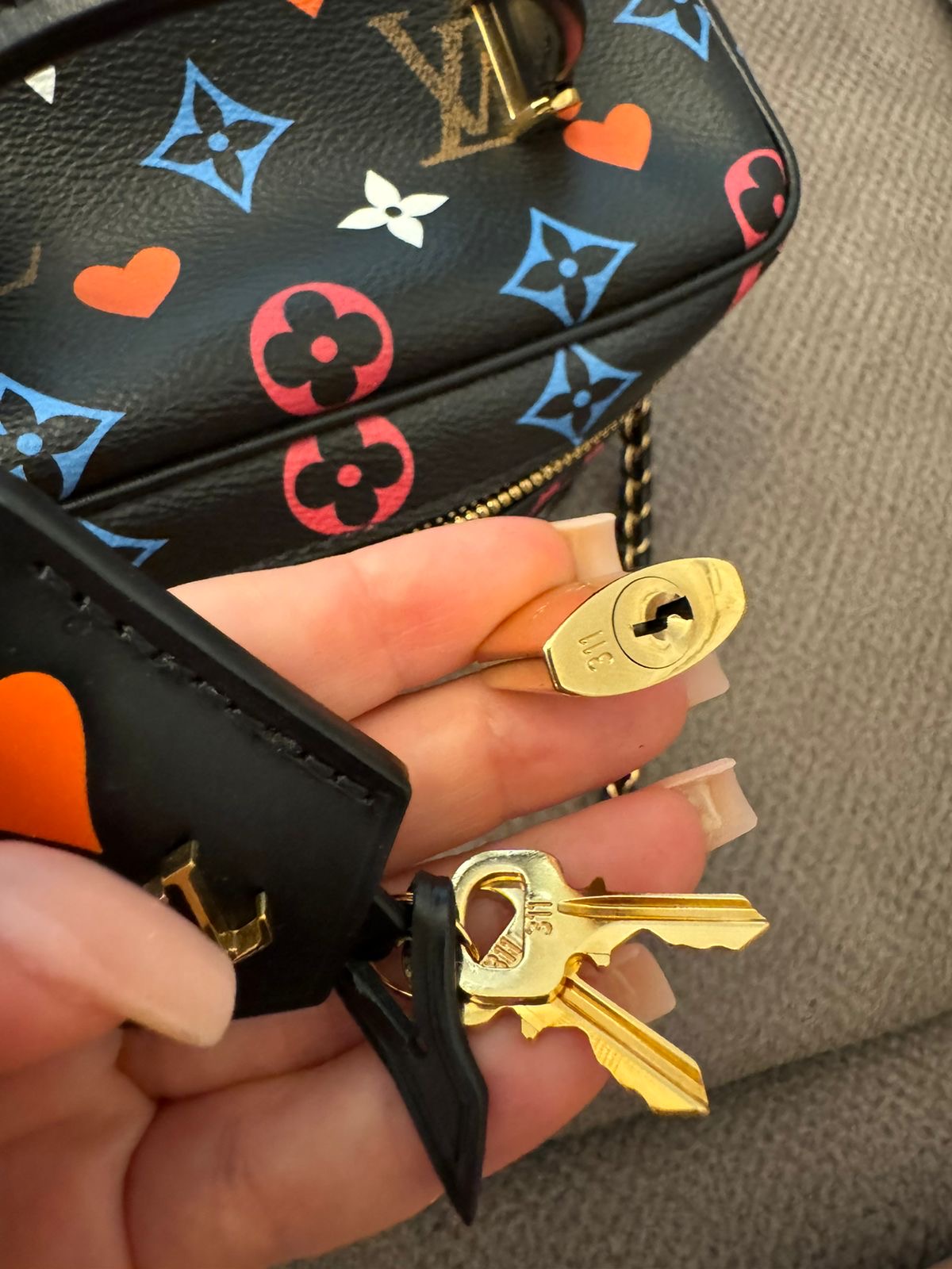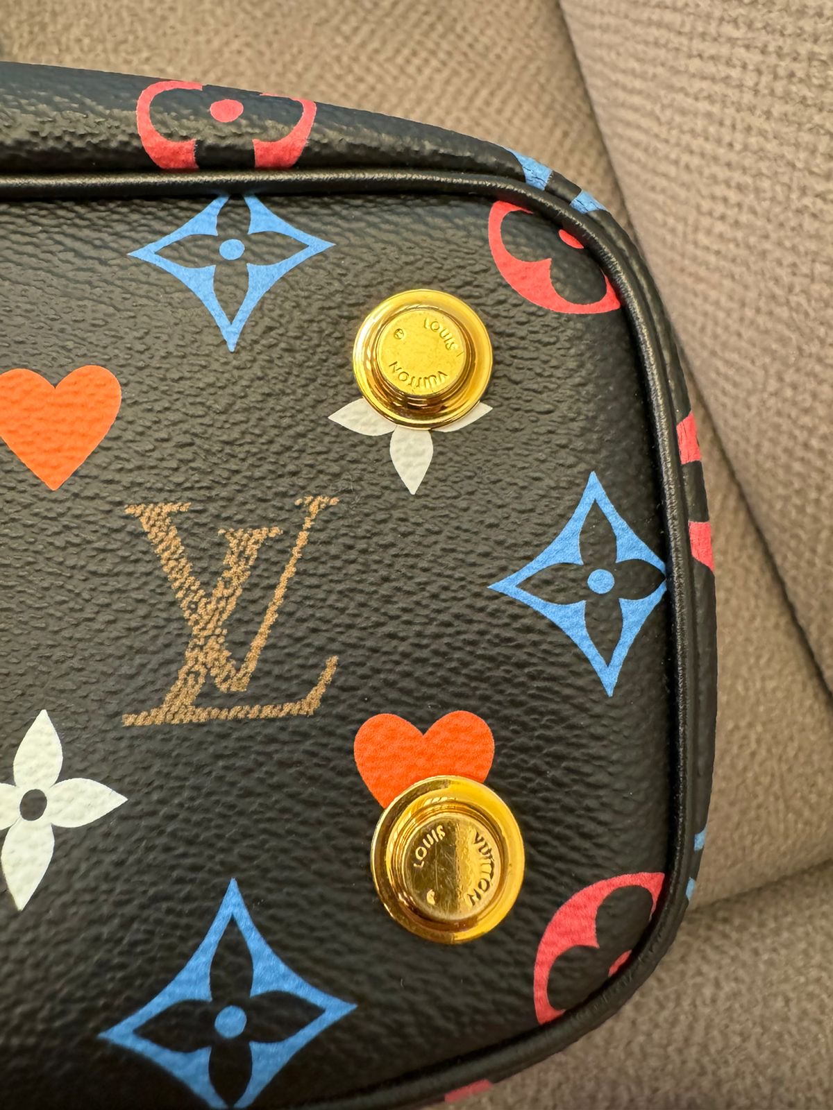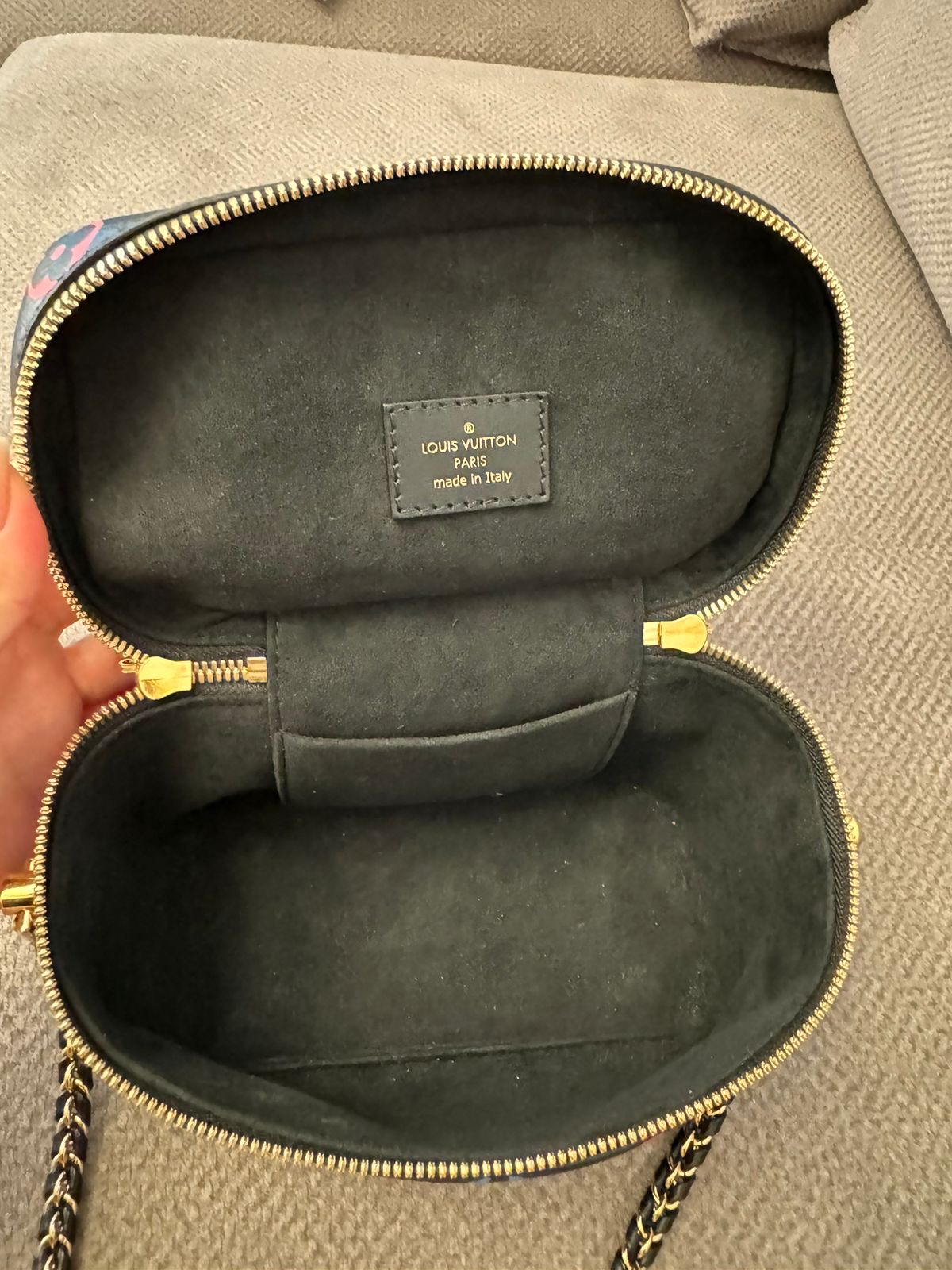 This stylish vanity case is part of Louis Vuitton’s Cruise 2021 Collection, which plays with Louis Vuitton’s iconic motif, mingling Monogram symbols with the four suits of a deck of cards. The bag features black cowhide leather trim, a matching handle, and an optional leather-threaded gold chain-link shoulder strap. The wrap-around zipper opens to a black microfiber interior with a small patch pocket.