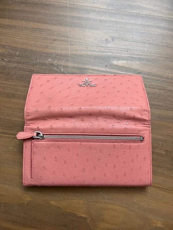 With removable ID holder This Continental wallet from Prada is smart, stylish and quite appealing. The ponk creation is crafted from Ostrich leather and features a brand logo detailing on the front snap closure. With a leather and nylon interior that houses a zip pocket and multiple card slots, this wallet is perfect to carry in hand or else can be stacked inside a handbag Length: 19 cm Width: 3 cm Height: 9 cm